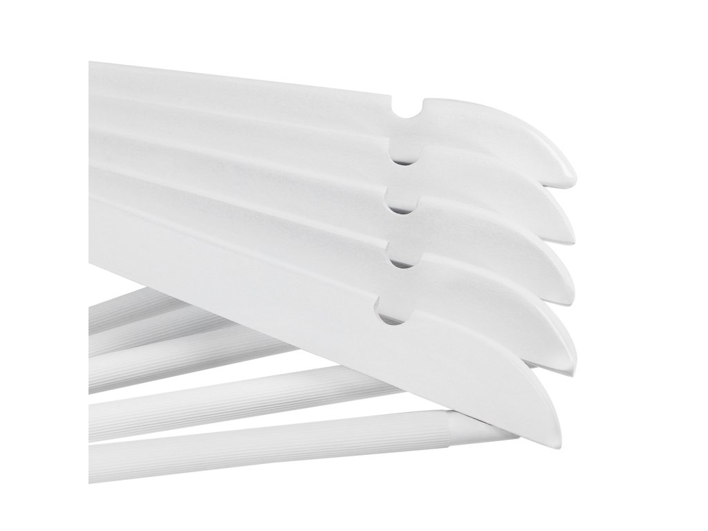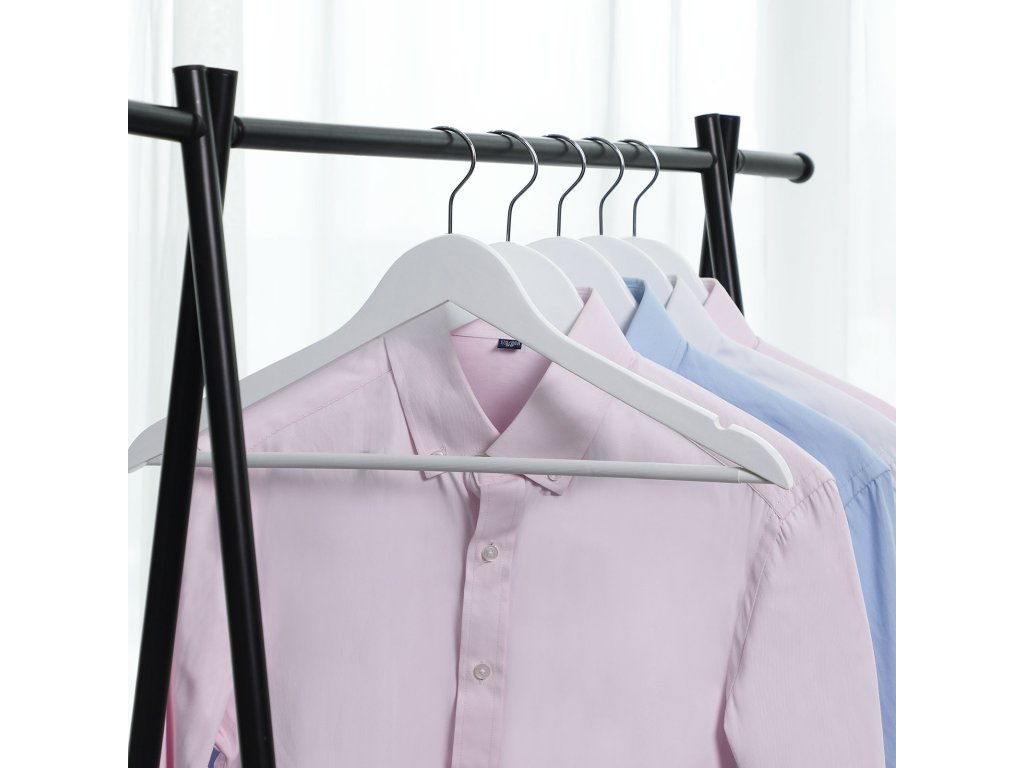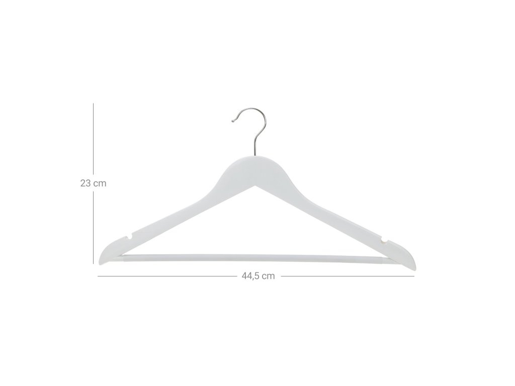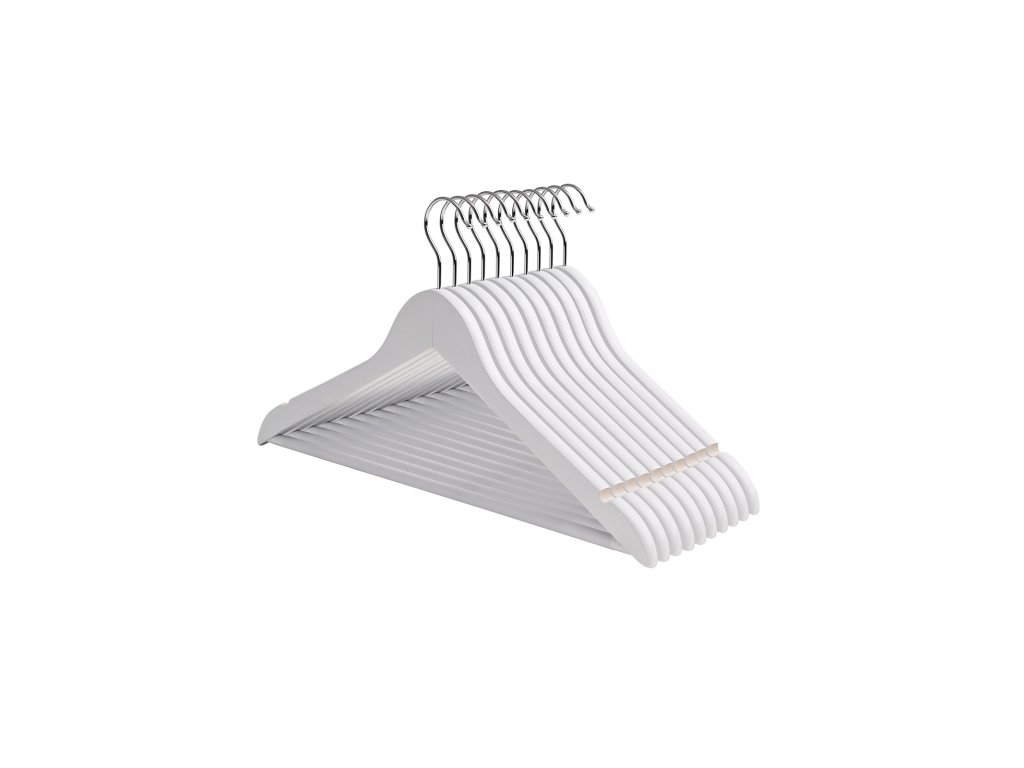 Dřevěná ramínka, sada 10 ks, věšáky na kabáty, věšáky na oblečení, s ramenními zářezy, protiskluzová tyč na kalhoty, 360° otočný háček, na obleky, košile, kabáty, bílé.
