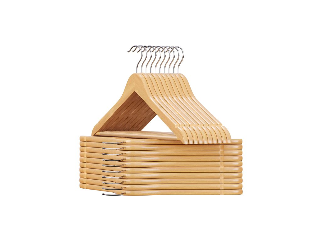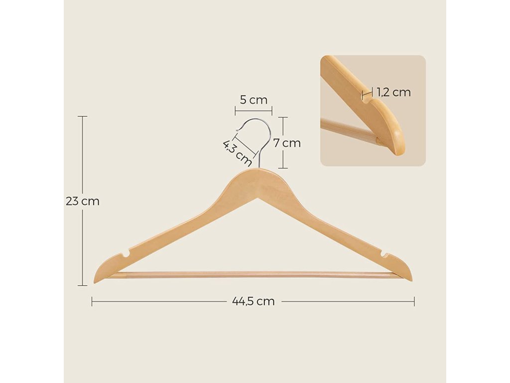 Dřevěná ramínka, věšáky na kabáty, věšáky na oblečení, s ramenními zářezy, protiskluzová tyč na kalhoty, 360° otočný háček, na obleky, košile, kabáty, přírodní a stříbrná barva, balení 20 ks.