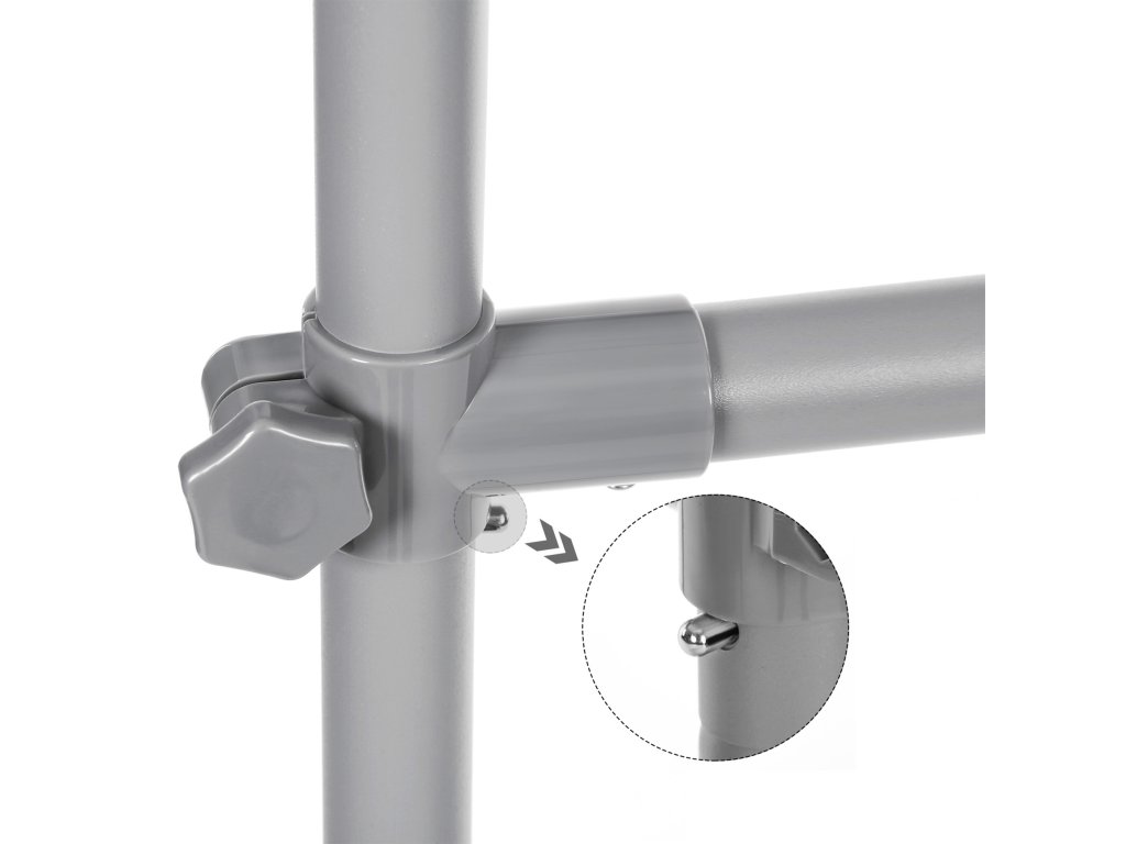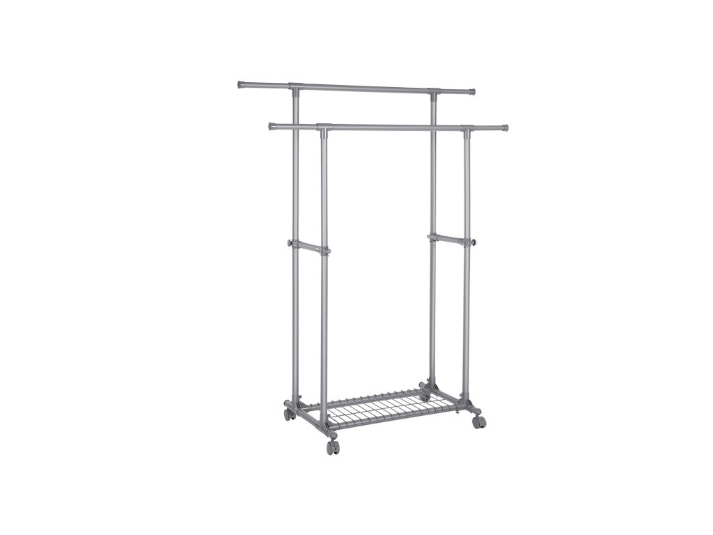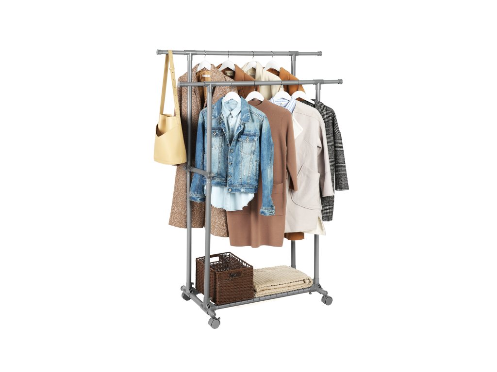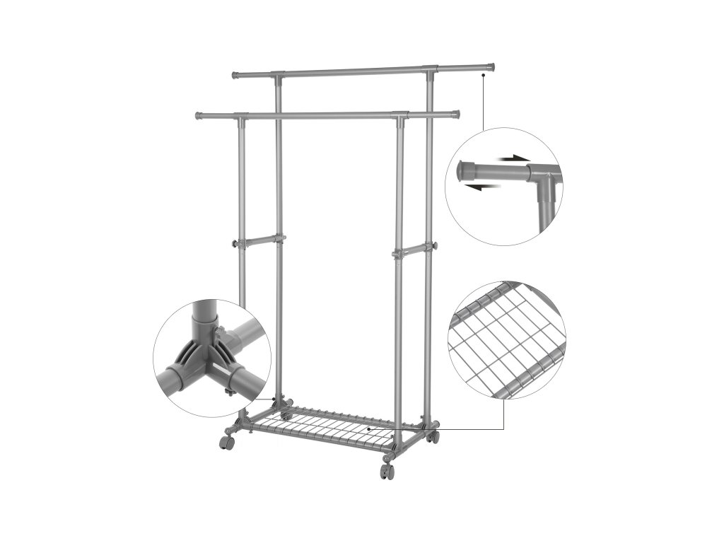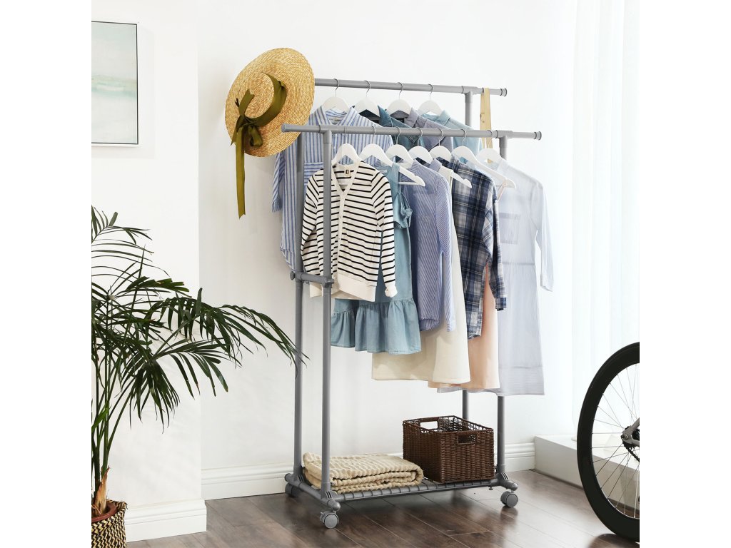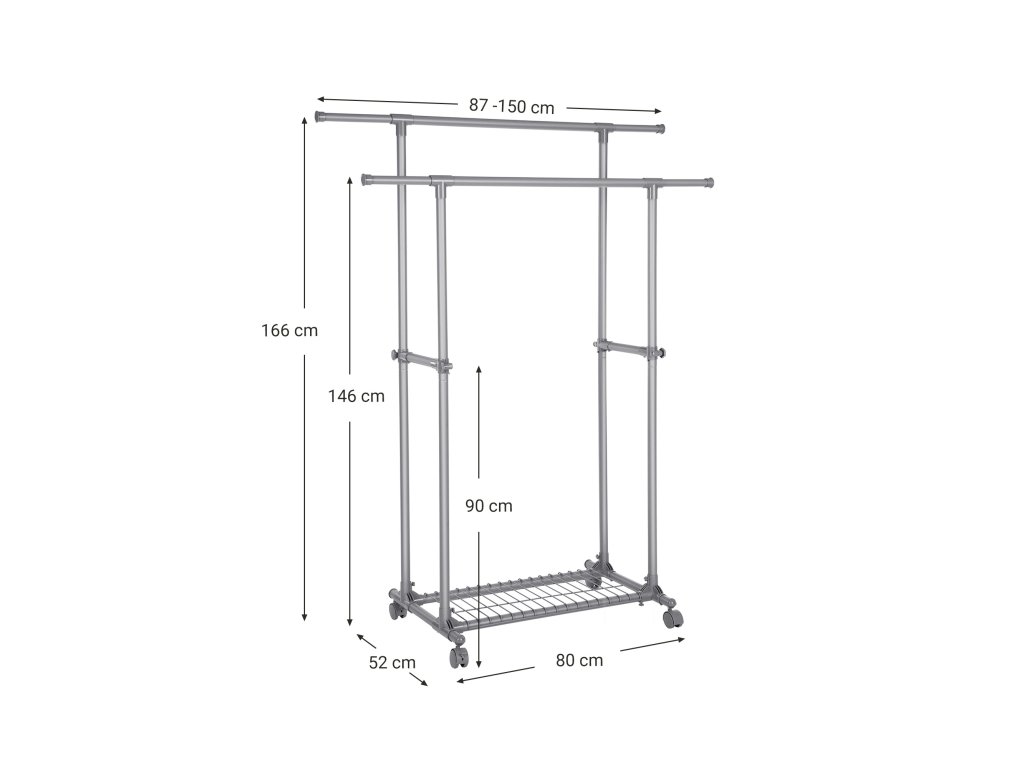 Dvojitý věšák na oděvy, výsuvný věšák na oděvy, od 87 do 150 cm, pojízdný věšák na oděvy s policí, robustní konstrukce, maximální statické zatížení 70 kg, na šátky, šedá.