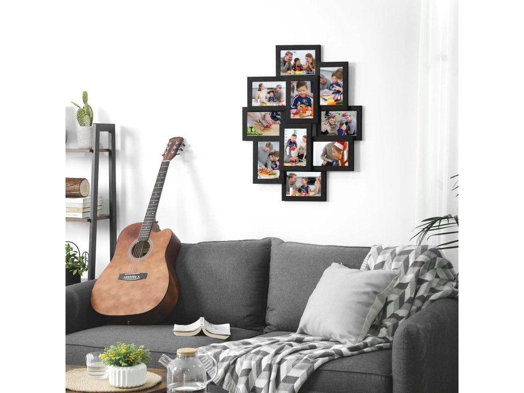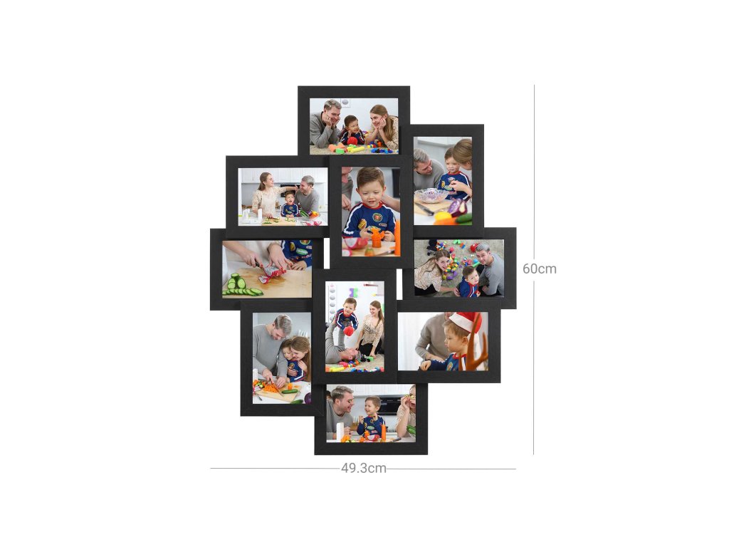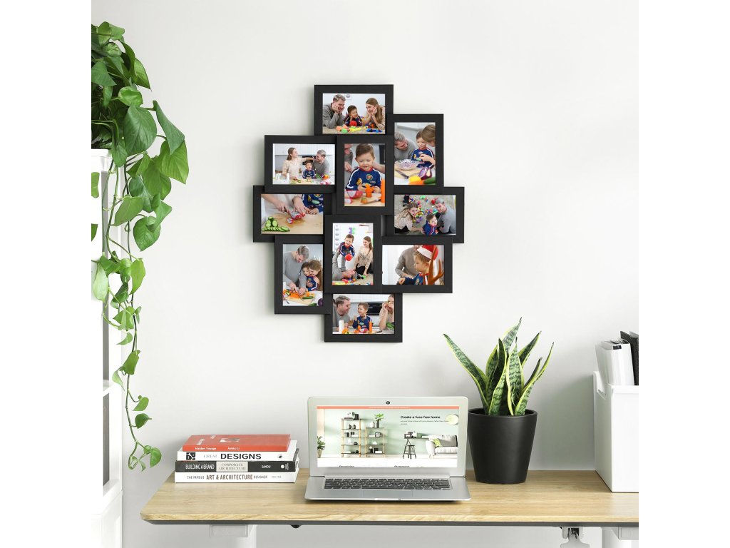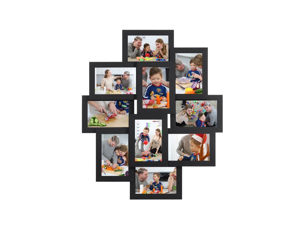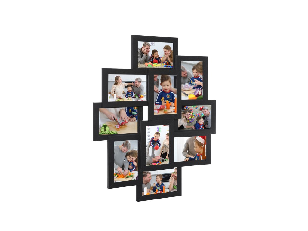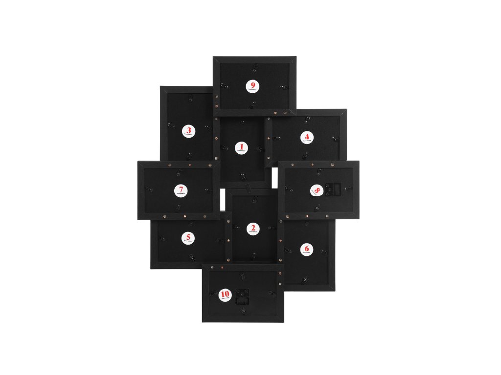 Fotorámeček koláž pro 10 fotografií v rozměrech 4" x 6" (10 x 15 cm), nástěnná fotogalerie z MDF, nutná montáž, černý.