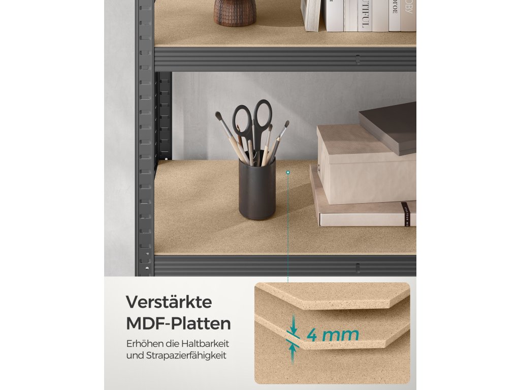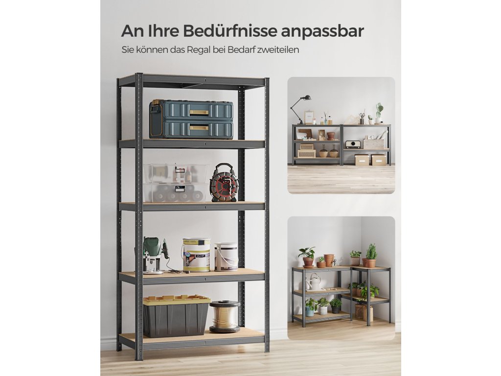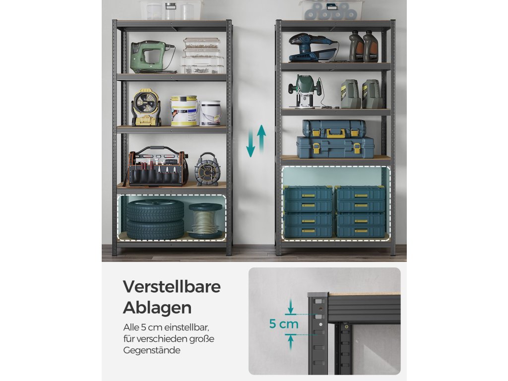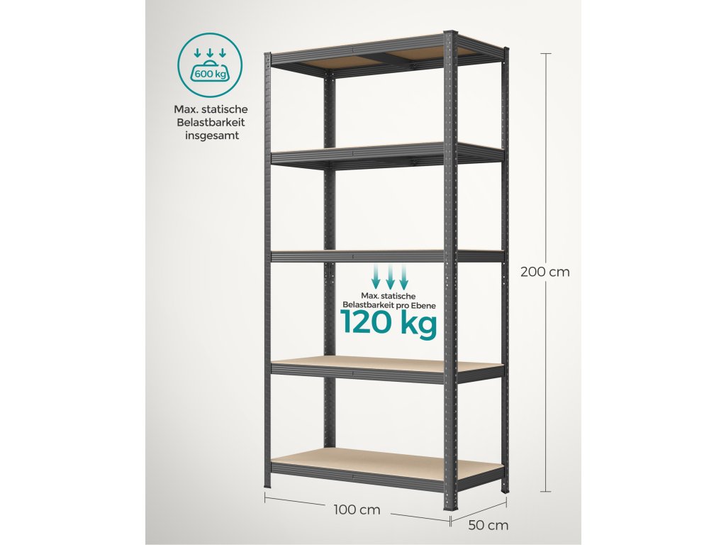 Robustní a stabilní Díky ocelovému rámu unese každé patro až 175 kg. Přiložená sada proti překlopení umožňuje připevnit tuto garážovou polici ke stěně pro ještě větší stabilitu a bezpečné používání. [Rozdělení na 2 části] Tuto úložnou polici lze rozdělit na 2 malé police, které můžete používat společně nebo samostatně podle svých potřeb. Můžete je také použít jako pracovní desku s úložným prostorem. [Nastavitelné police] Díky otvorům na rámu této úložné jednotky (vzdálenost otvorů je 5 cm) lze výšku desek snadno nastavit podle velikosti vašich věcí. [Velké rozměry, vysoká nosnost] Rozměry tohoto regálu jsou 50 x 100 x 200 cm, jeho nosnost je 875 kg. Lze jej použít v garáži, skladu, sklepě nebo na půdě k uložení nářadí a vybavení. [SNADNÁ MONTÁŽ BEZ NÁSTROJŮ] Tento regál pro těžké náklady se snadno montuje, stačí jen vložit náhradní díly podle vyobrazeného návodu, dokonce není potřeba žádné nářadí.| Kategorie: | Regály a poličky |