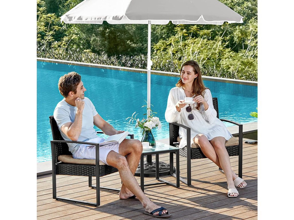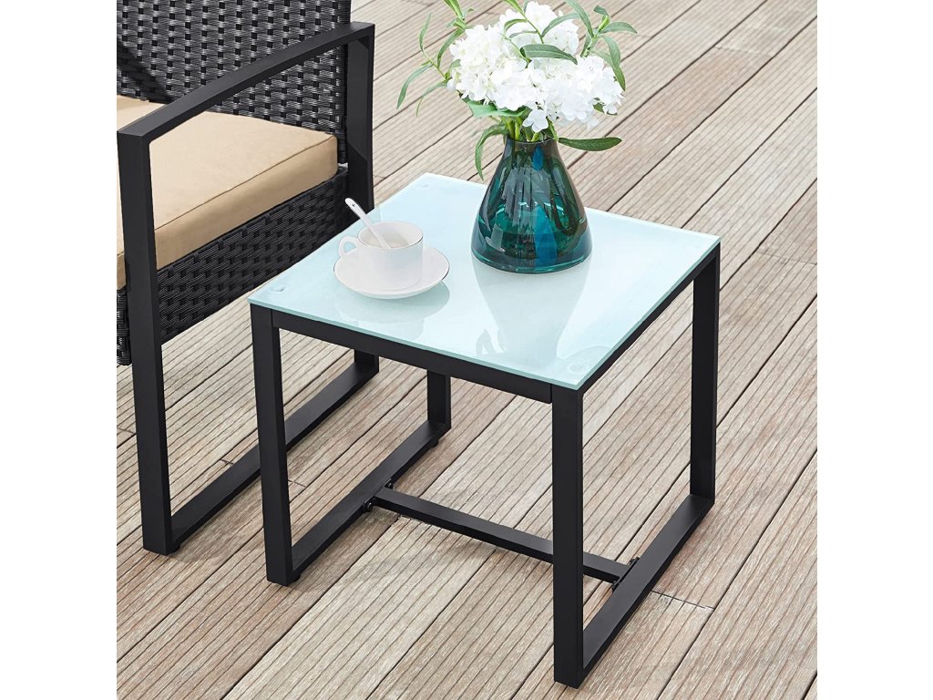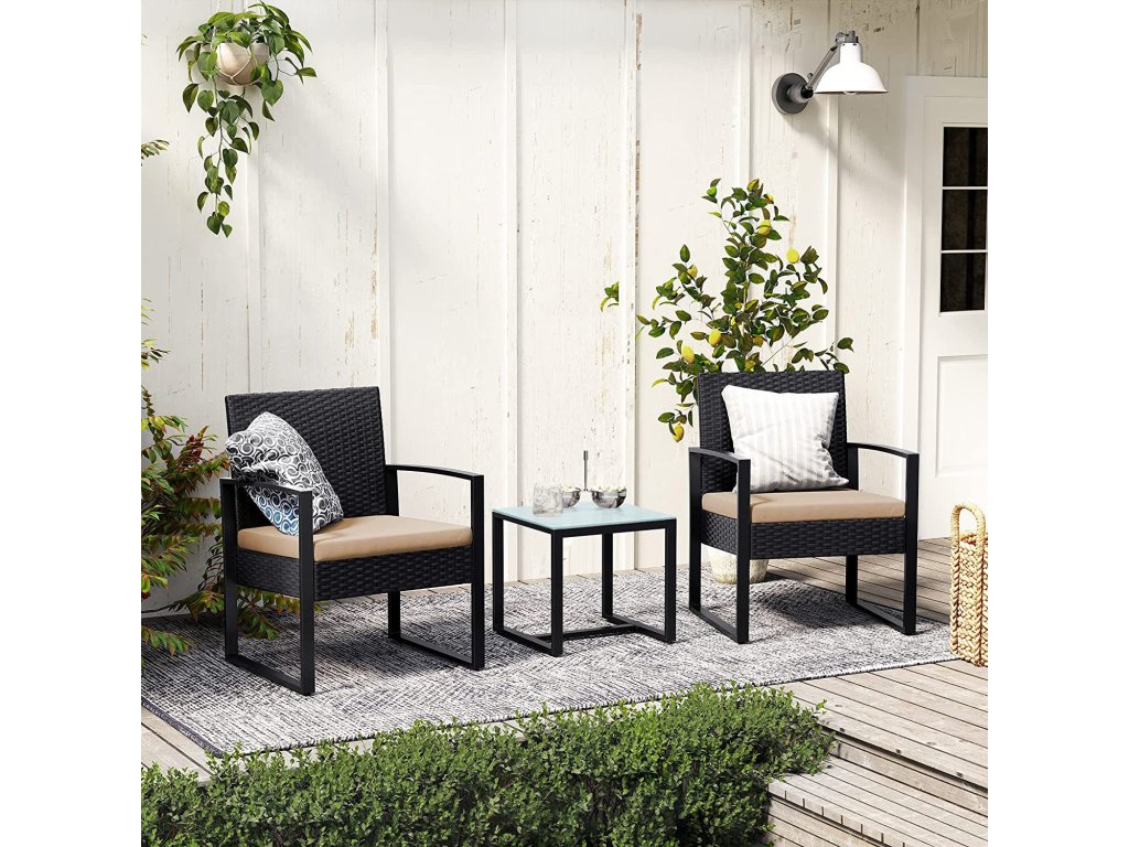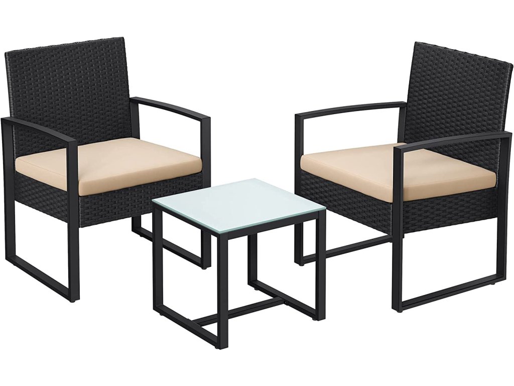 Balkonový zahradní nábytek z polyratanu. Sada obsahuje stůl a 2 židle. V černo-béžové barvě.