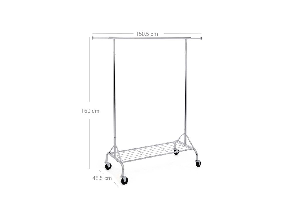 Nastavitelná šířka - věšák na oblečení lze na obou stranách v horní části rozšířit (110,5 - 150,5 cm), což poskytuje dostatek prostoru, a na každé straně je zarážka, takže ramínka nemohou ze stojanu sklouznout. Horní kolejnici na oděvy lze zatížit až 50 kg.