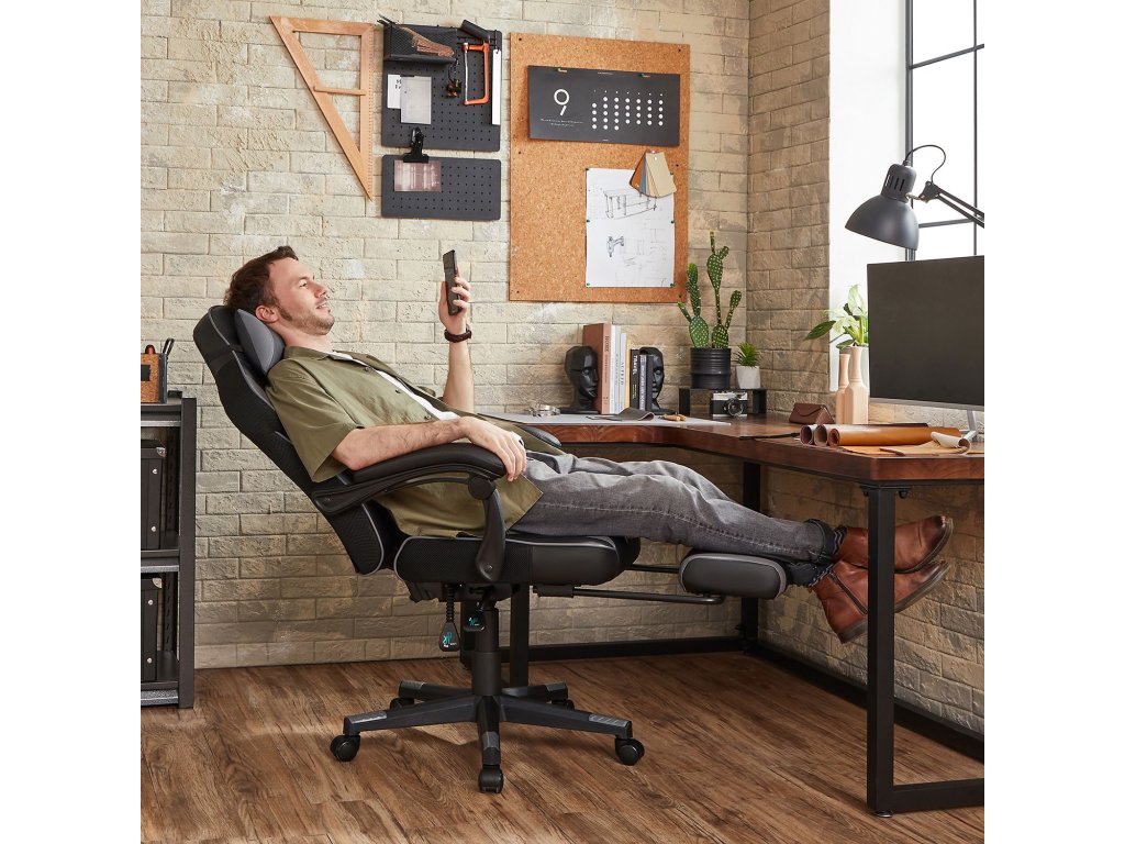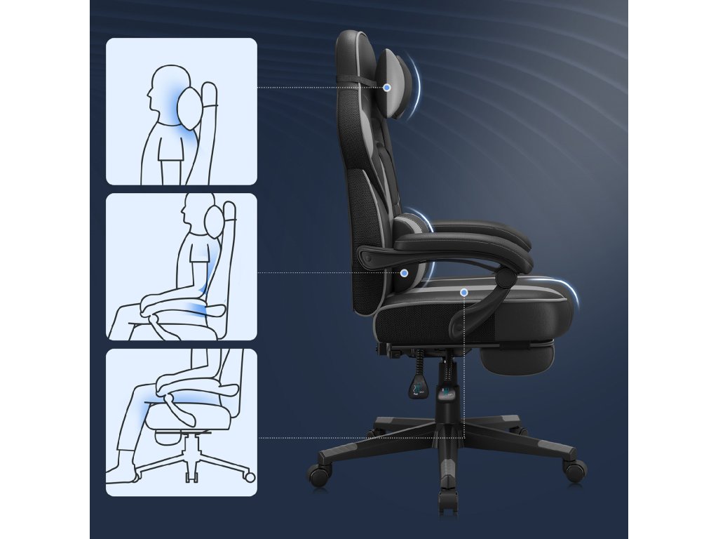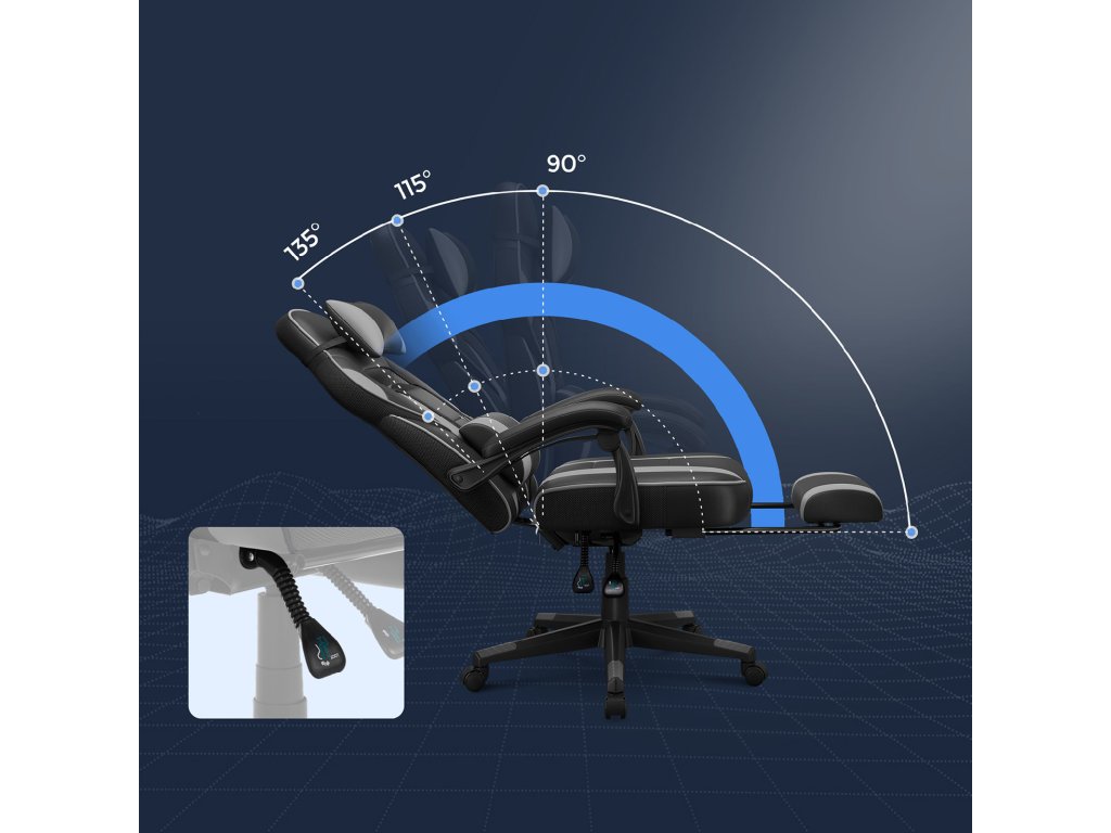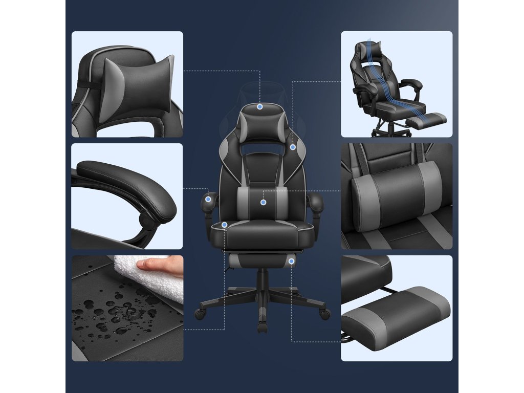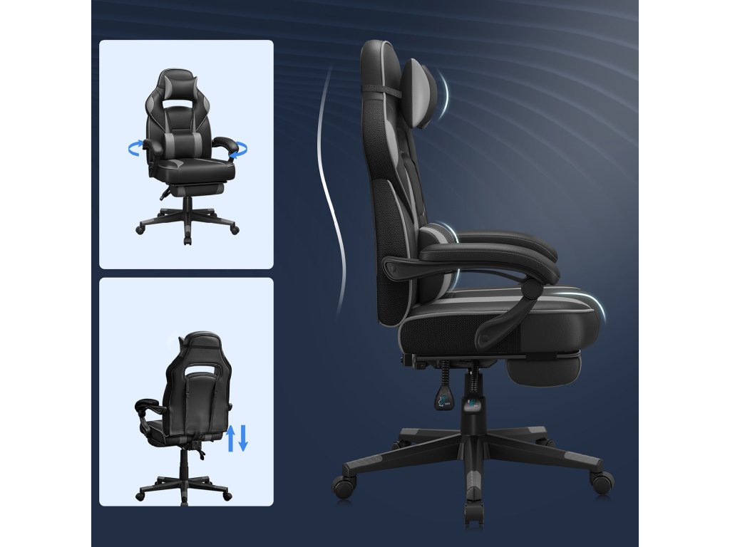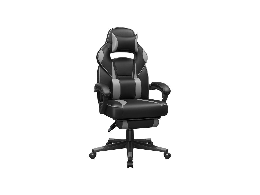 Herní kancelářská židle s podnožkou, opěrkou hlavy a bederním polštářem, výškově nastavitelná, ergonomická, úhel sklonu 90-135°, nosnost 150 kg, černá + šedá.