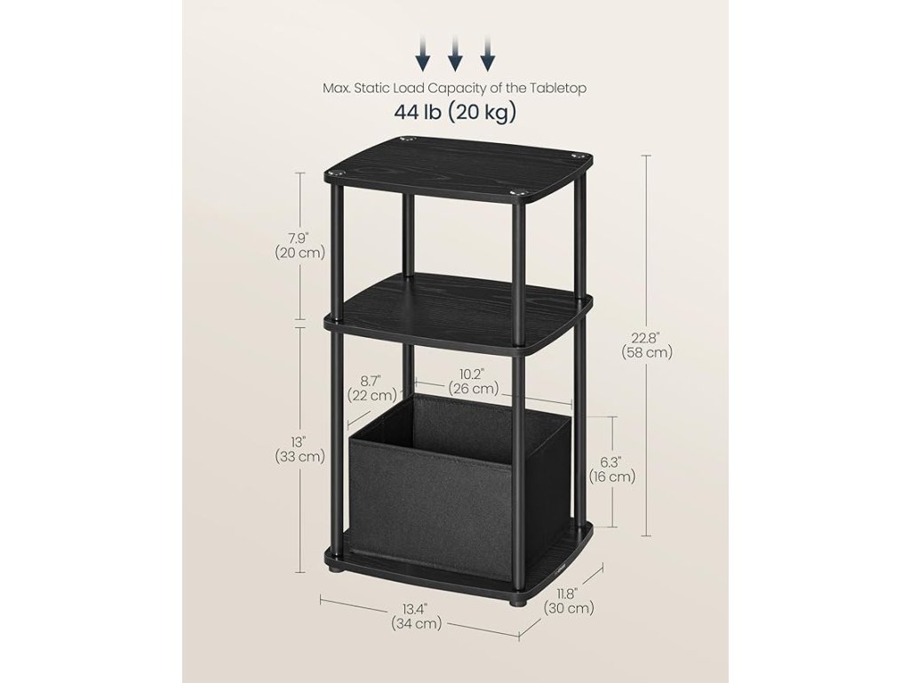 Odkládací stolek, noční stolek, odkládací stolek se 3 policemi, látkový koš, do ložnice, obývacího pokoje, ocelový rám, 30 x 34 x 58 cm, industriální, černá Ebony.