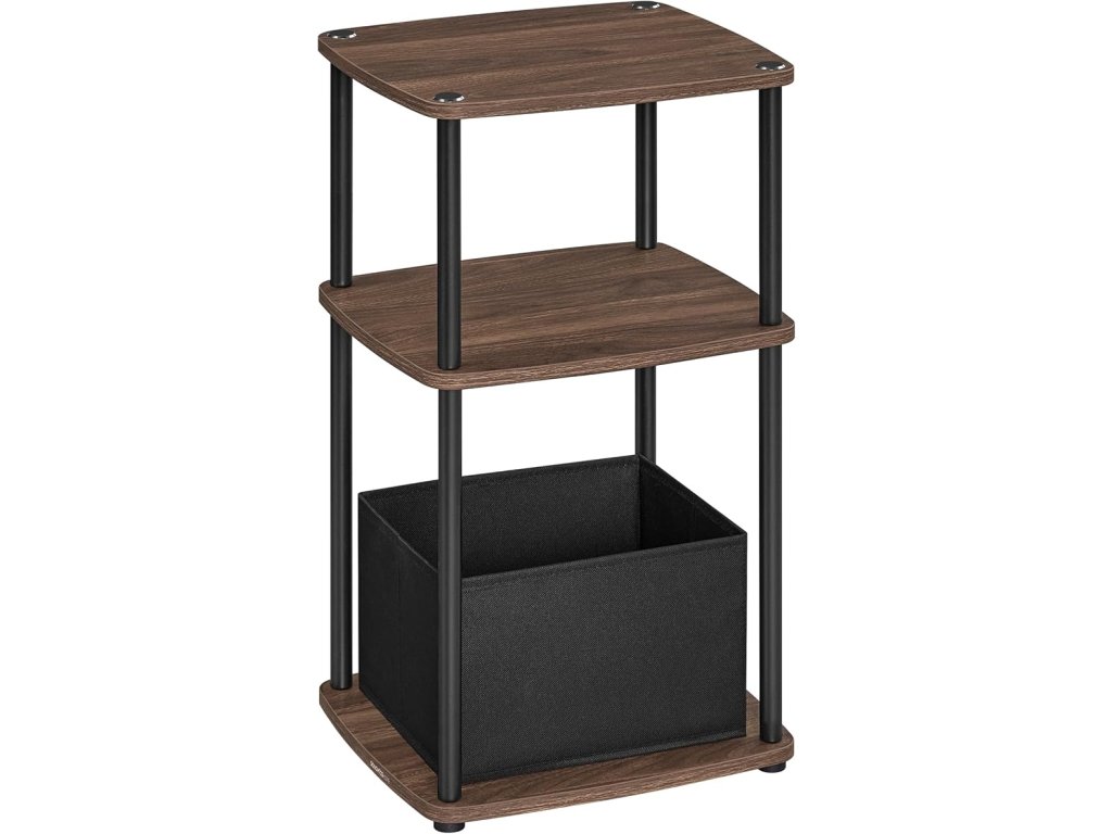 Odkládací stolek, noční stolek, odkládací stolek se 3 policemi, látkový koš, do ložnice, obývacího pokoje, ocelový rám, 30 x 34 x 58 cm, industriální, ořech eben.