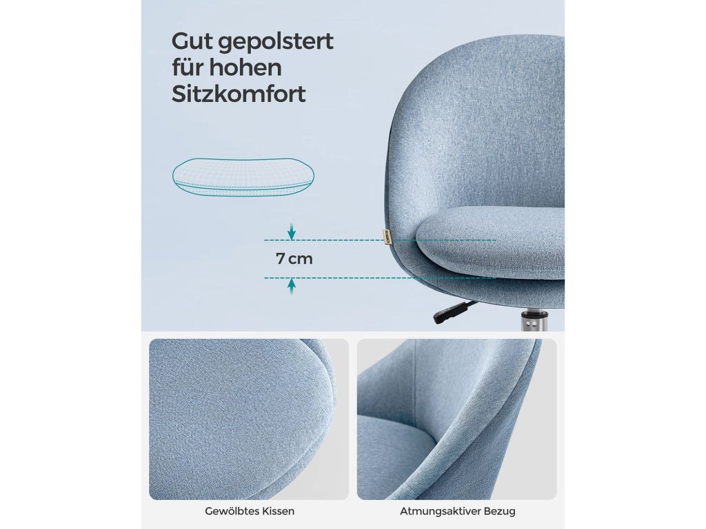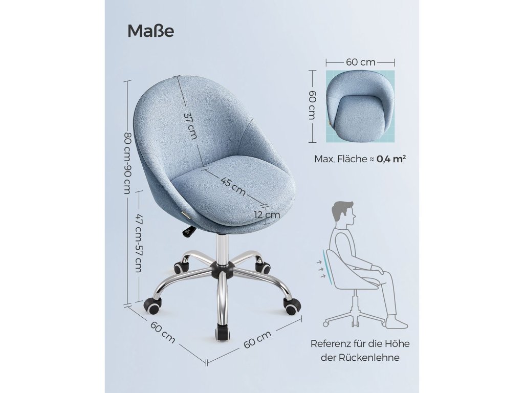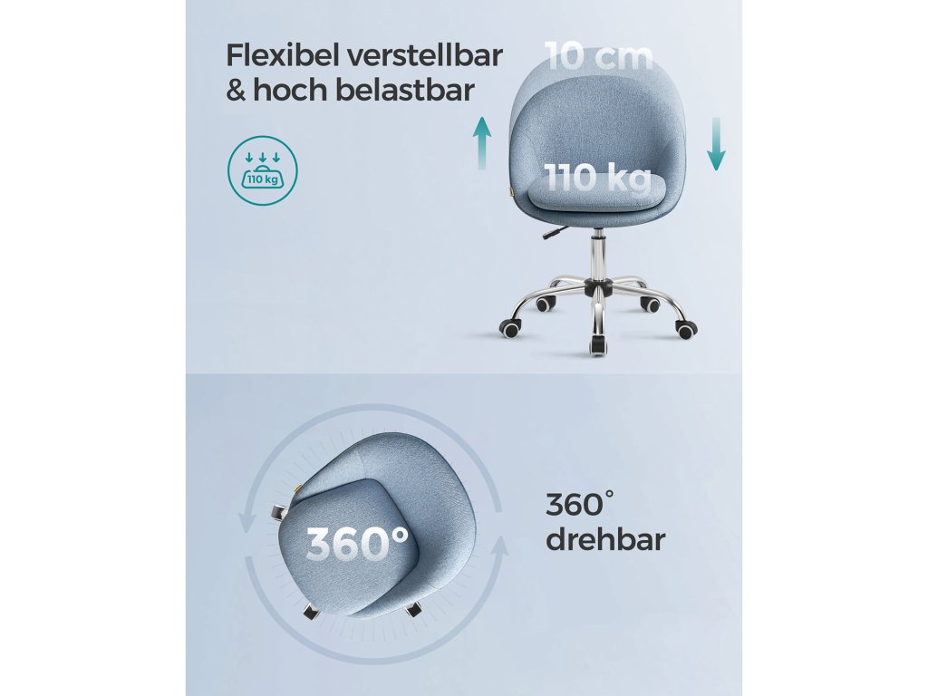 Stylové a univerzální Díky elegantnímu vzhledu a jednoduchým geometrickým liniím dodá tato otočná židle vašemu pokoji jedinečný šarm. Můžete ji používat k práci, studiu nebo líčení. [Úspora místa] Tato kompaktní kancelářská židle otočná o 360° (60 x 60 cm) je výškově nastavitelná o 10 cm a nemá područky. Když židli nepoužíváte, můžete ji zasunout pod stůl a ušetřit tak místo. [Vysoký komfort sezení] Dvojitý dobře polstrovaný polštář (horní 7 cm silný), zakřivený tvar velké sedací plochy zmírňuje tlak na vaše boky; potah ze směsi bavlny a lnu je prodyšný. Vše nabízí vysoký komfort sezení [Snadná instalace] Připevněte základní desku ke spodní části sedadla pomocí šroubů, nainstalujte plynové lahve a kolečka - stačí pár kroků a počítačová židle je sestavena. [Spolehlivé držení] Židle prošla testem pevnosti a odolnosti SGS (zpráva č. AJHL2005001059FT; Majitel: dodavatel; vydáno 27. 10. 2022), unese až 240 kg, poskytuje stabilní a spolehlivou oporu;| Kategorie: | Kancelářské židle |