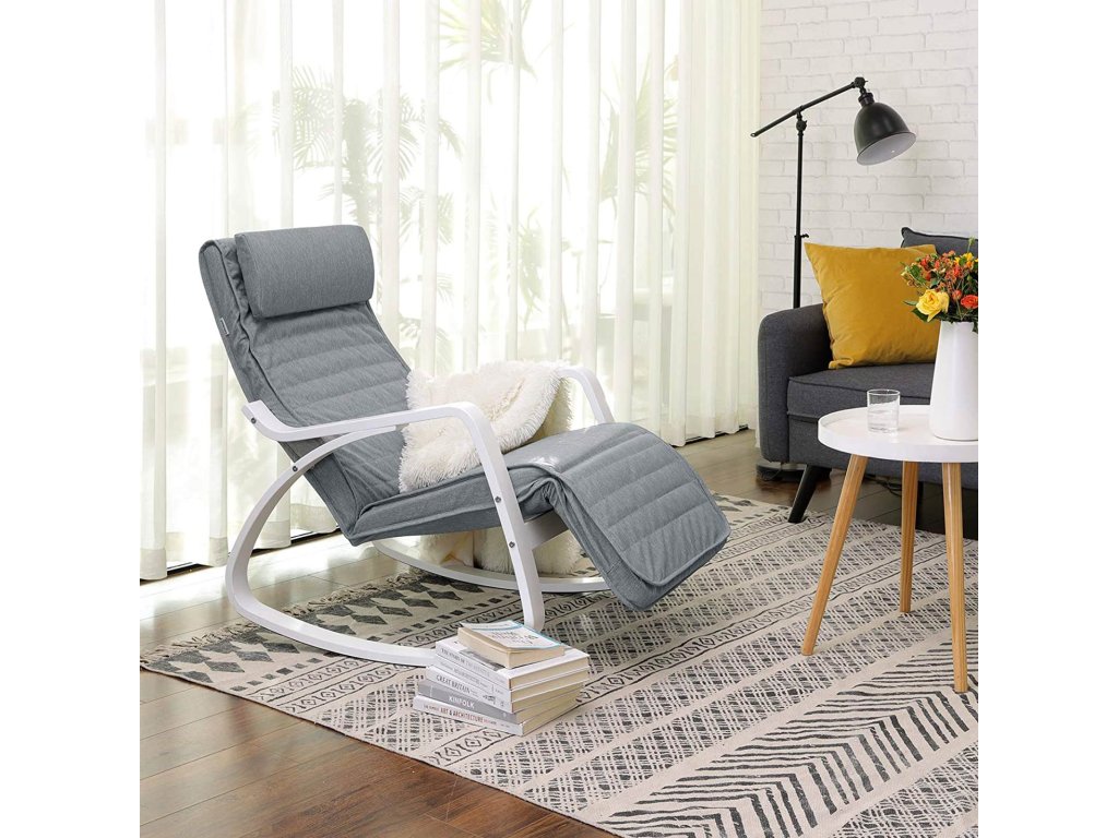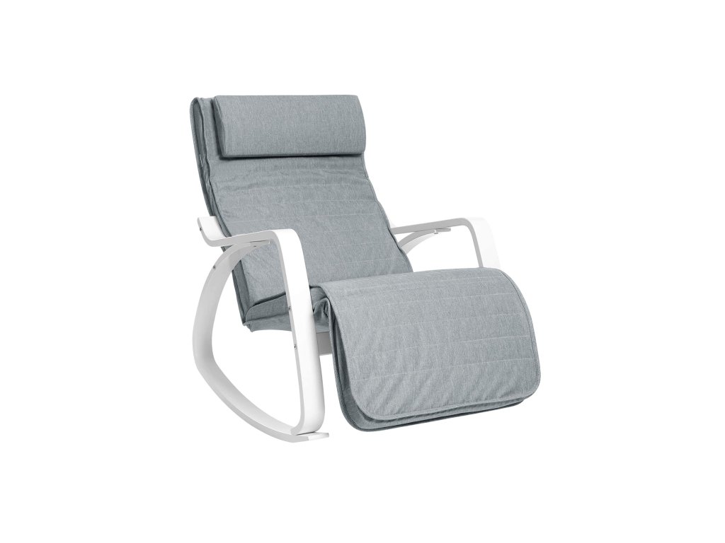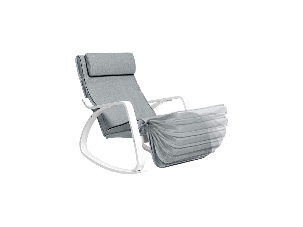 Houpací relaxační křeslo, březové dřevo, podnožka nastavitelná 5 úrovní, umělý lněný potah, maximální zatížení 150 kg, světle šedé.