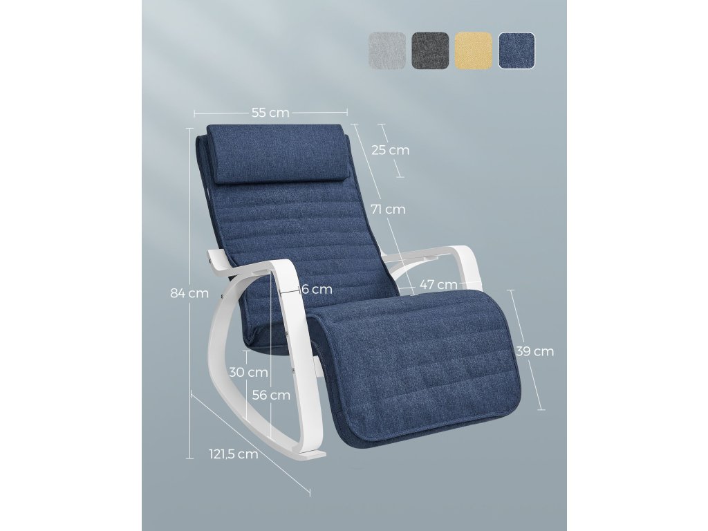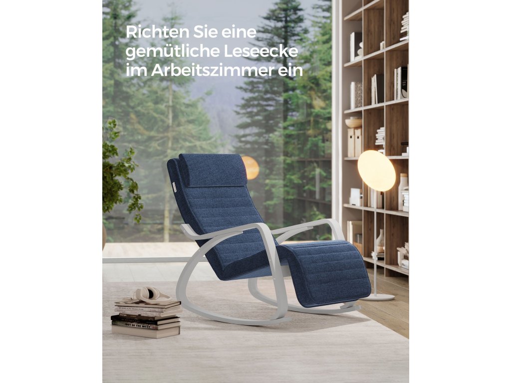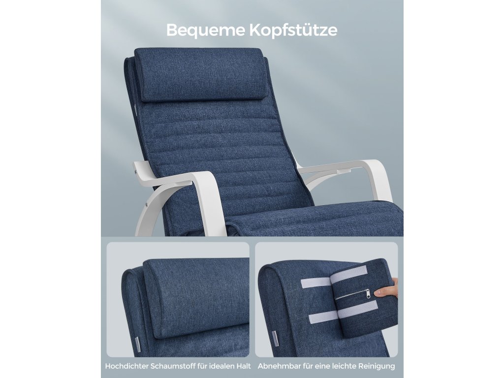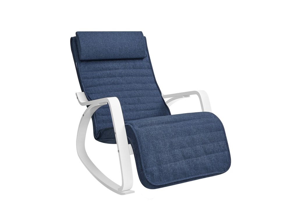 Houpací křeslo s područkami z březového dřeva, houpací křeslo s 5-cestnou nastavitelnou opěrkou nohou, zatížení 150 kg pro ložnici, obývací pokoj, půlnoční modrá, bílá.