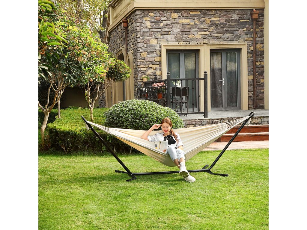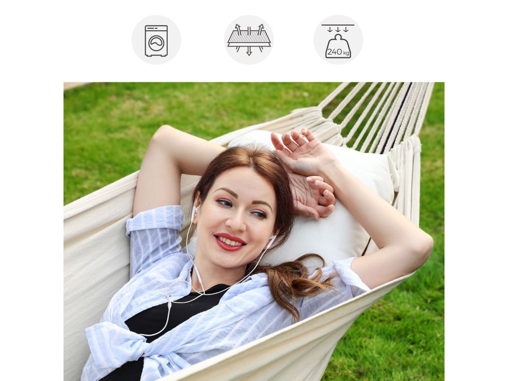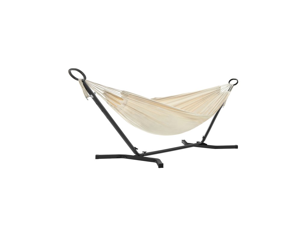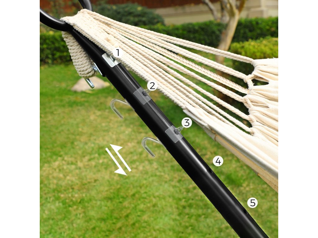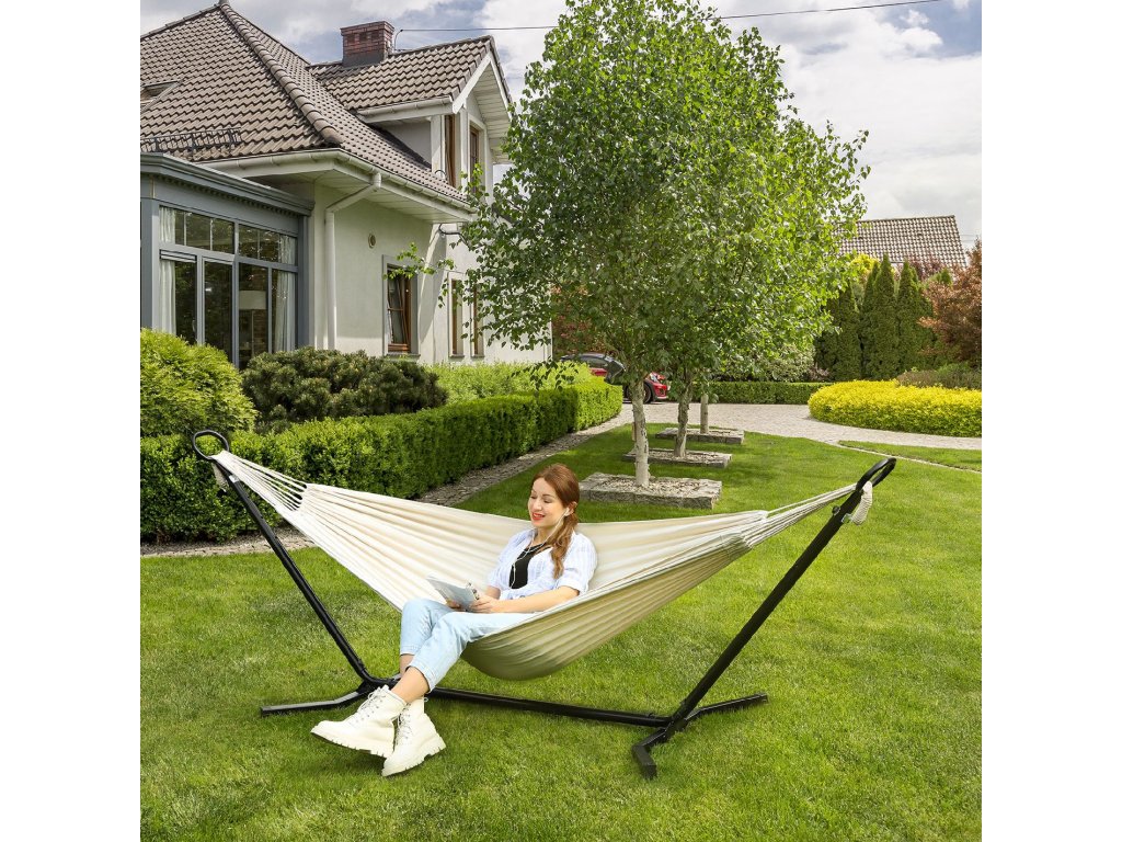 Pro dobré časy: Lehněte si se svou drahou polovičkou a podívejte se na západ slunce. nebo se uvelebit se svým dítětem a trávit spolu čas... tato houpací síť - vyrobená z prodyšné bavlněné a polyesterové tkaniny a s nosností 240 kg - je jako stvořená pro chvíle odpočinku s blízkými.Uvolněná duše: Ano, tady se vaše duše může houpat, ale ne na stojanu houpací sítě. Díky prodlouženým nohám na obou stranách, které zabraňují převrácení, můžete bez obav relaxovat na těle i na duši.Nebe nebo Země? Chtěli byste se při ležení v houpací síti dotýkat prsty trávy, nebo raději sahat po hvězdách? K dispozici je 5 nastavitelných výšek můžete snadno nastavit výšku houpací sítě