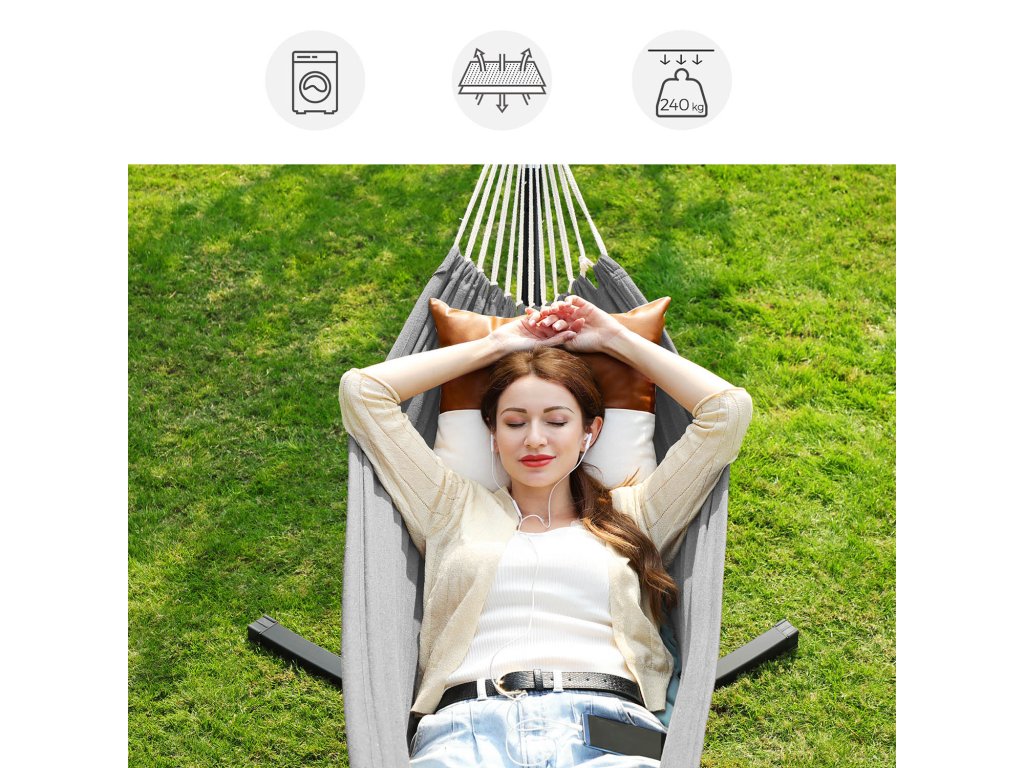 Pro dobré časy: Lehněte si se svou drahou polovičkou a podívejte se na západ slunce. nebo se uvelebit se svým dítětem a trávit spolu čas... tato houpací síť - vyrobená z prodyšné bavlněné a polyesterové tkaniny a s nosností 240 kg - je jako stvořená pro chvíle odpočinku s blízkými.Uvolněná duše: Ano, tady se vaše duše může houpat, ale ne na stojanu houpací sítě. Díky prodlouženým nohám na obou stranách, které zabraňují převrácení, můžete bez obav relaxovat na těle i na duši.