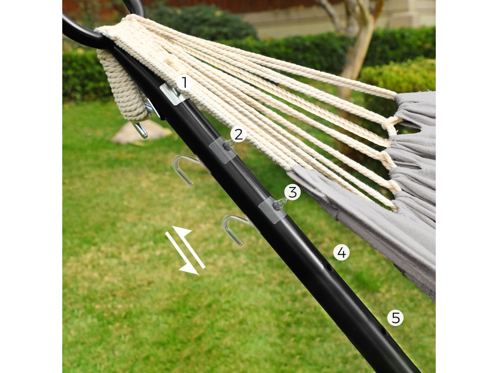 Nebe nebo Země? Chtěli byste se při ležení v houpací síti dotýkat prsty trávy, nebo raději sahat po hvězdách? K dispozici je 5 nastavitelných výšek můžete snadno nastavit výšku houpací sítě