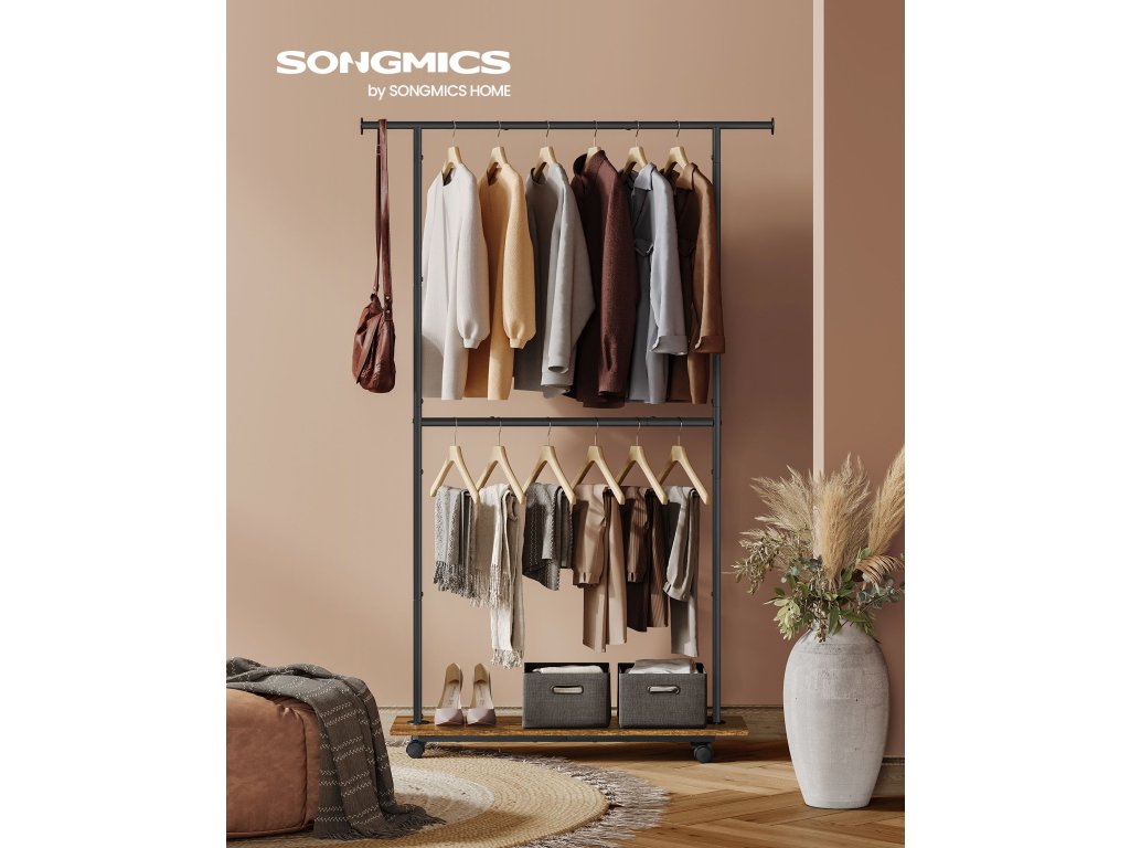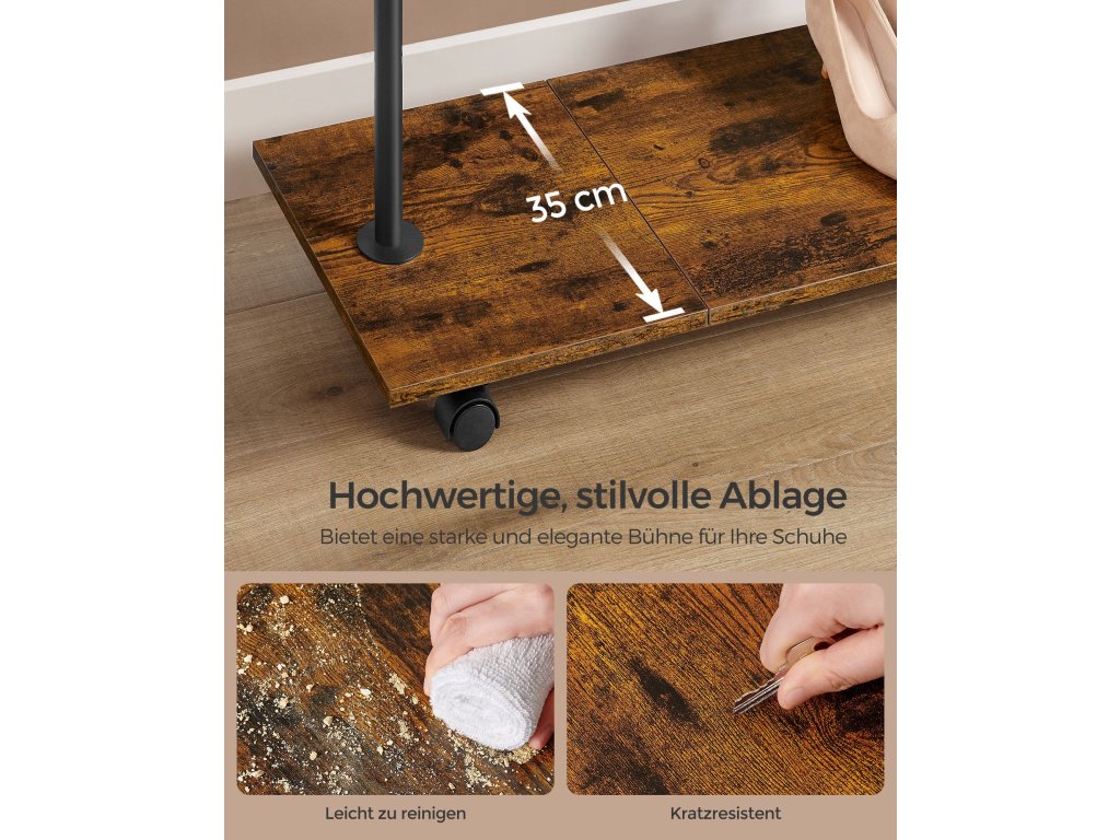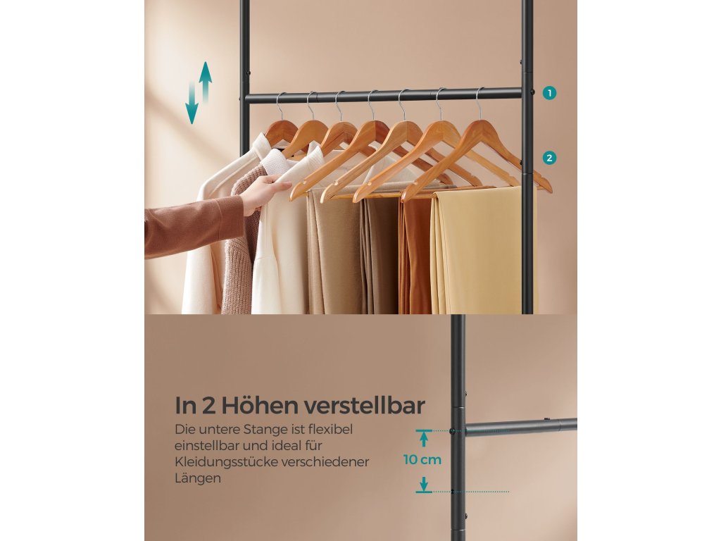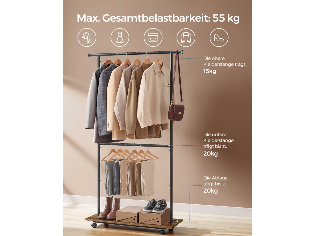 Nastavitelný a prostorný Spodní tyč na oblečení je nastavitelná ve 2 výškách (celková výška stojanu není nastavitelná). Horní tyč je vhodná pro dlouhé kabáty nebo šaty. Spodní police poskytuje prostor pro boty a krabice.Snadné přemístění Tento věšák na oblečení má 4 kolečka otočná o 360°, z nichž 2 jsou vybavena brzdami, takže jej můžete snadno přemístit z ložnice do šatny nebo tam, kam potřebujete.Robustní a stabilní Horní tyč unese až 15 kg, spodní tyč až 20 kg a police až 20 kg. Můžete bezpečně zavěsit zimní kabáty a uložit těžké boty.Jednoduché, ale elegantní Díky čistým liniím a elegantní barevné kombinaci vintage hnědé a inkoustově černé. tento věšák v industriálním stylu poskytuje dokonalý prostor pro vaše oblíbené oblečení a zároveň dodá vašemu domovu charakter.Snadná montáž: Podrobný návod (čeština není zaručena), jasně označené díly a přiložený montážní nástroj vám pomohou sestavit tento stojan na kabáty. abyste si s tímto kusem nábytku mohli rychle vychutnat optimální pohodlí.| Kategorie: | Stojany na oblečení |