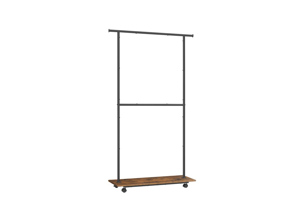 Věšák na oděvy s policí, 2 kolejnice, šířka 98,5 cm, maximální zatížení 55 kg, nastavitelná výška spodní tyče, ocel, vintage hnědá/černá barva.
