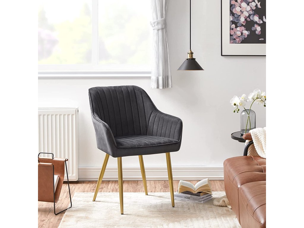 Vyzařuje eleganci: půvabný sametový potah s prošíváním v kombinaci s kovovými nohami ve zlaté barvě dělají z této židle opravdovou ozdobu.Vše pro vaše pohodlí: díky směrem ven zakřivenému opěradlu a područkám a širokému sedáku se nebudete cítit stísněně. Měkký samet a 7 cm vysoké polstrování sedáku zajišťují ještě větší pohodlí. Už nikdy nebudete chtít vstát!.