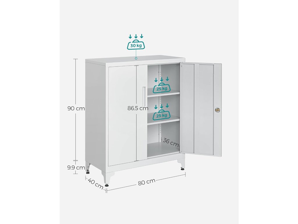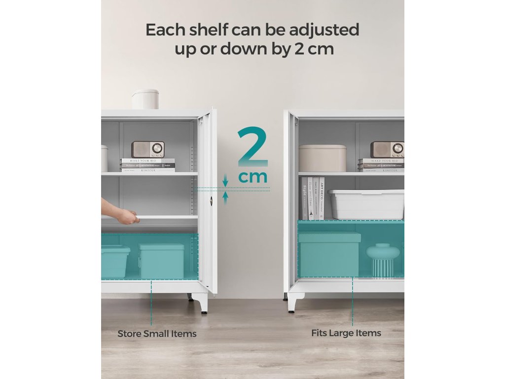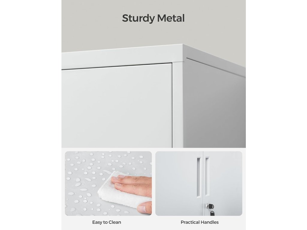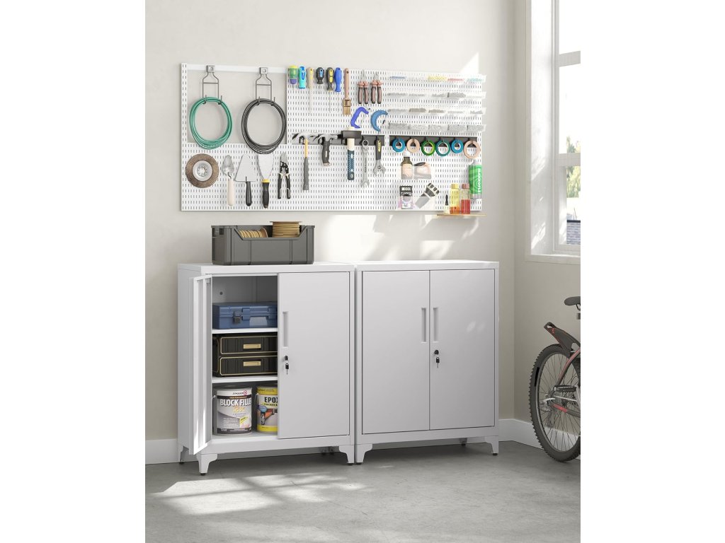 Hodí se do každé domácnosti Tato kancelářská skříň se díky své jednoduché barvě a designu hodí do každé domácnosti. Můžete ho použít k uspořádání nářadí v garáži, souborů a dokumentů v kanceláři nebo třeba k uložení lahví a sklenic v kuchyni.Prostorné a nastavitelné police Tato uzamykatelná skříň o rozměrech 15,7 "D x 31,5 "Š x 35,4 "V poskytuje dostatek úložného prostoru pro vaše dokumenty, složky a další věci. Dvě police lze výškově nastavit, takže je ideální pro ukládání různě velkých předmětů.Robustní a odolná Tato garážová skříň je vyrobena z oceli s práškovým nástřikem, která je odolná proti korozi a zajišťuje pevnou a stabilní konstrukci. Jeho povrch je odolný vůči vodě a snadno se čistí, takže si můžete zachovat jeho zbrusu nový vzhled po mnoho let.Prémiový ocelový zámek Ocelový zámek, který je dodáván se 2 klíči, je odolný proti korozi a opotřebení, takže všechny vaše osobní věci jsou bezpečně chráněny.Snadná montáž Kovová skříňka je dodávána s jasným návodem a označenými díly, takže její montáž je rychlá a snadná.| Kategorie: | Kancelářské skříně |