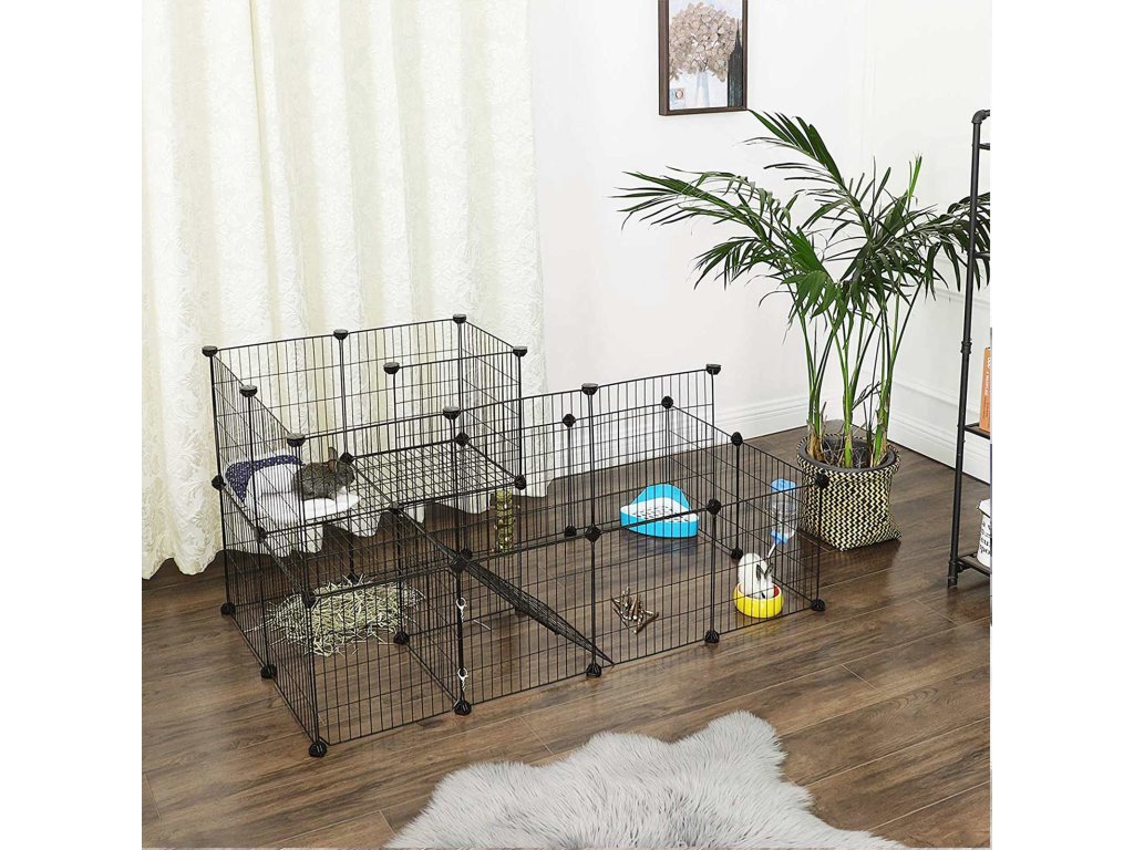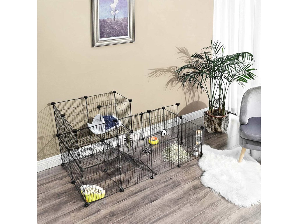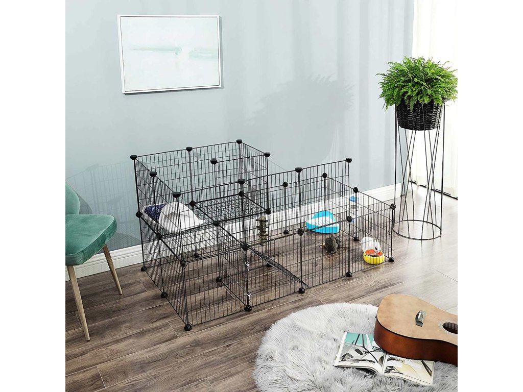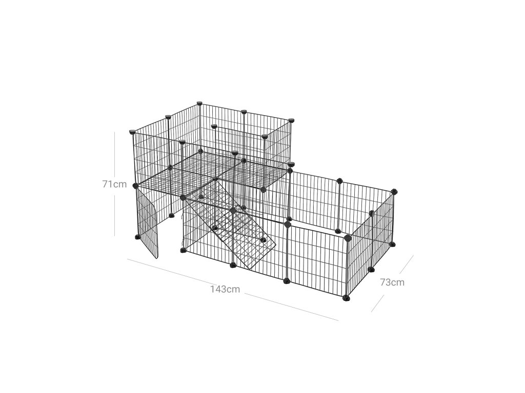 DENNÍ A NOČNÍ PROSTOR: S tímto výběhem pro zvířata vytvoříte v přízemí dětské hřiště umístěním otočného kola a hraček pro domácí mazlíčky. zatímco z druhého patra uděláte spací prostor pro svého chlupatého přítele, poděkuje vám sladkýma očima.PŘIPRAVEN ZA OKAMŽIK: Vytvoření plotu DIY je jednoduché a zábavné! Jednoduše spojte 27 panelů a 1 drátěná dvířka pomocí 37 spojovacích prvků a přiloženého kladívka a hned můžete své chlupaté zvíře vyzkoušet; bude ho rád poznávat!VAŠE ZVÍŘÁTKA SI ZASLOUŽÍ KVALITU: Odolné plastové konektory ABS a zajišťovací popruhy udržují panely stabilní a protiskluzové podložky zvyšují tření s podlahou.DVEŘE SE DVĚMA VÝHODAMI: Není nutné rozebírat ohrádku pokaždé, když chcete svého mazlíčka hýčkat; otevřít dveře a snadno je uchopit. Karabina ji navíc chrání před útěkem na neznámá místa;JEŠTĚ NEJSTE SPOKOJENI? Náš zákaznický servis je vám k dispozici v případě jakýchkoli dotazů. Dopřejte svému příteli maximální pohodlí hned teď!