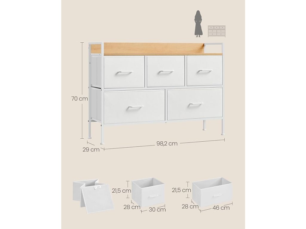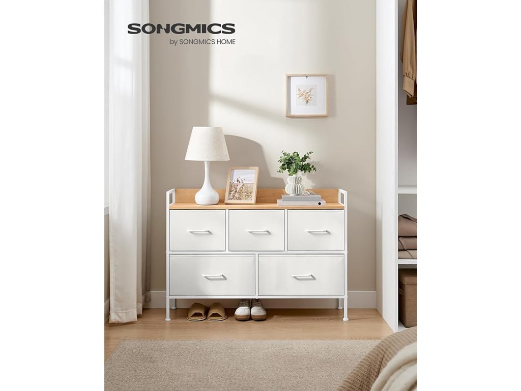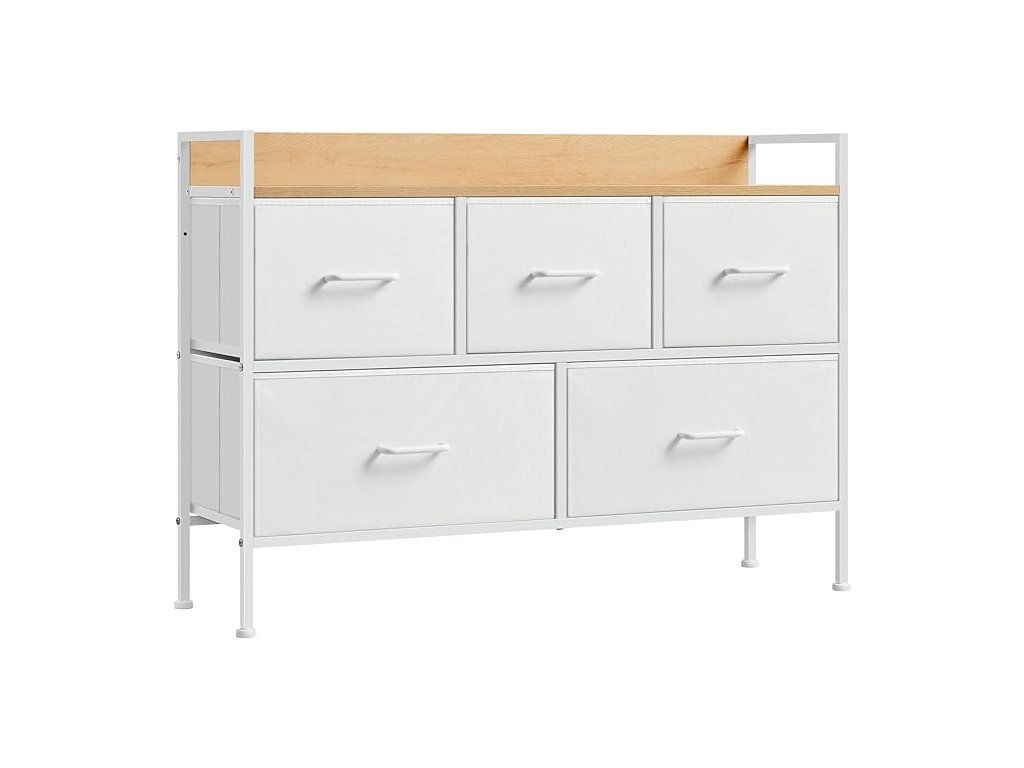 Komoda, skříň, skříňka na oblečení, 5 dveří z textilu s poutky, rám z metalu, moderní styl, bílá barva a béžová barva.