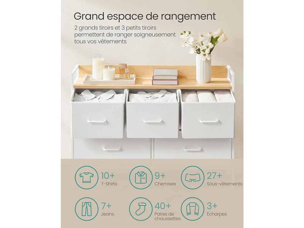 【POUR RANGER ET TRIER】Avec 5 tiroirs (2 grands et 3 petits), rangez vos affaires par catégorie. Chaque grand tiroir accueille 60-70 chaussettes, 13-16 T-shirts ou 7-11 pantalons, chaque petit accueille 40-45 chaussettes, 9-10 T-shirts ou 4-7 pantalons.