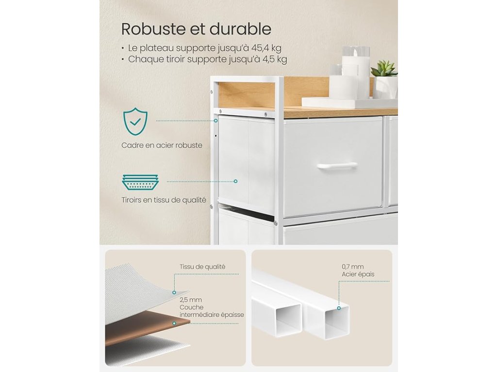【STABLE ET SÛRE】Cette commode est équipée de pieds réglables qui assurent la stabilité même sur un sol irrégulier. Le kit anti-basculement fourni assure une stabilité et une sécurité supplémentaires.