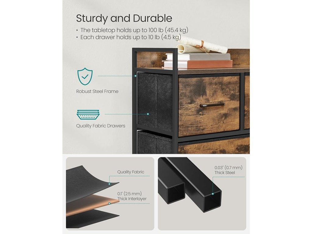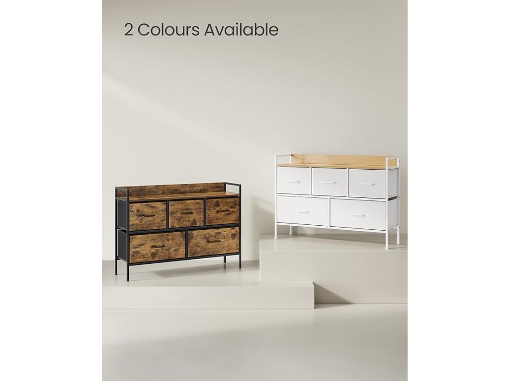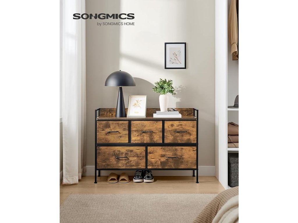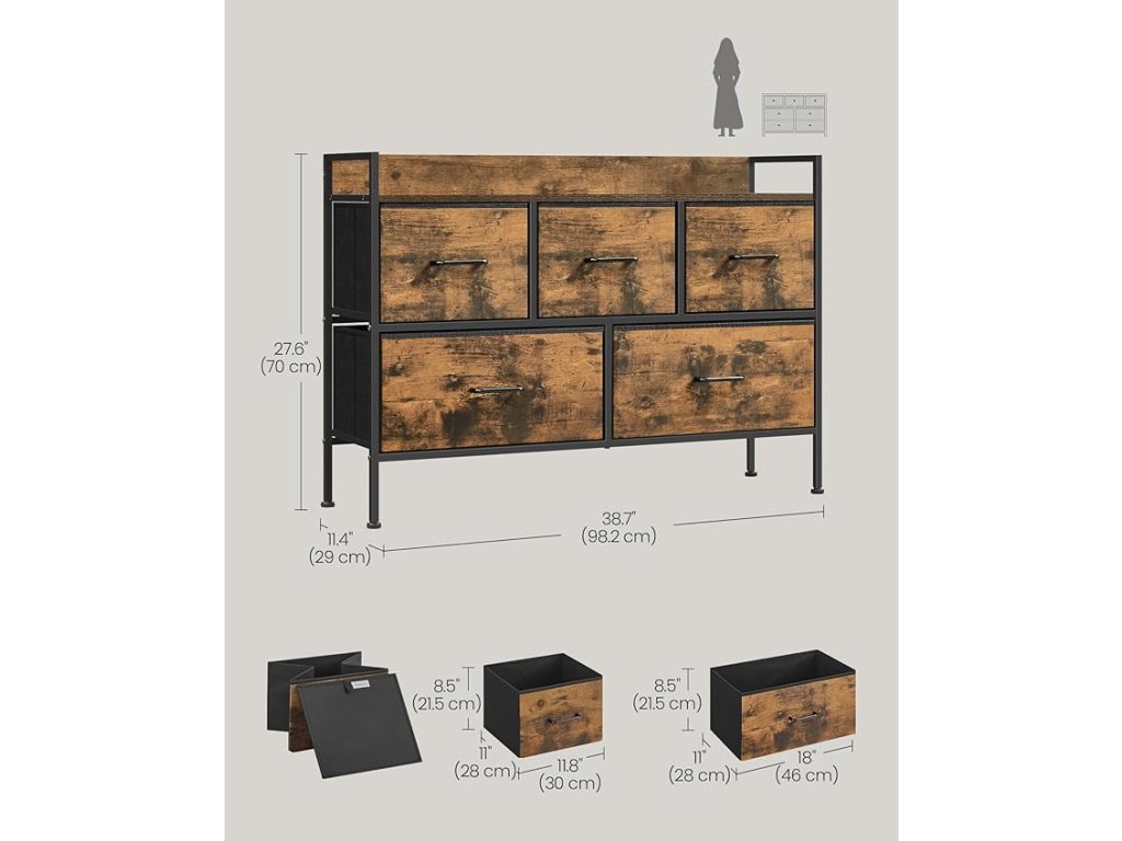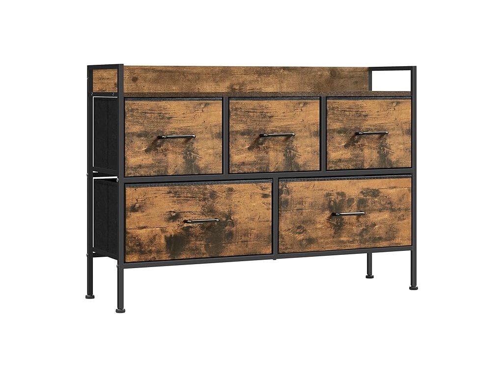 Komoda do ložnice, 5 látkových zásuvek s úchyty, úložný organizér, do obývacího pokoje, předsíně, ocelový rám, rustikální hnědá a inkoustově černá.