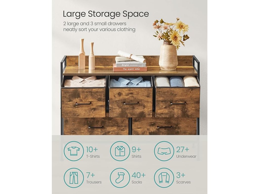 【TŘÍDIT A ORGANIZOVAT S LEHKOSTÍ】Tato komoda má 3 malé a 2 velké zásuvky, z nichž každá má ideální velikost pro uložení různých věcí od ponožek a triček až po džíny. usnadňuje třídění a organizaci oděvů.
