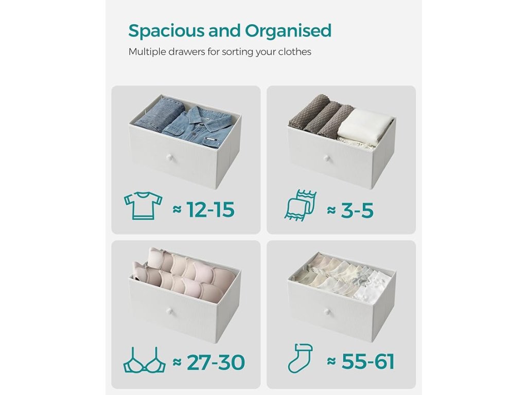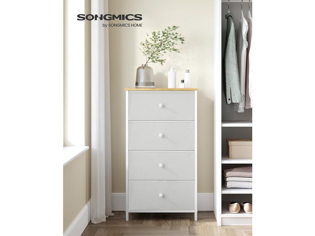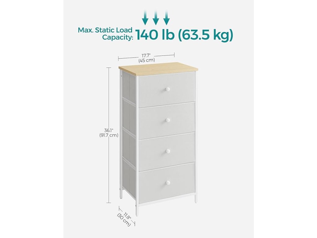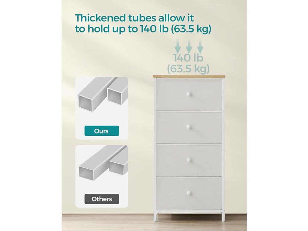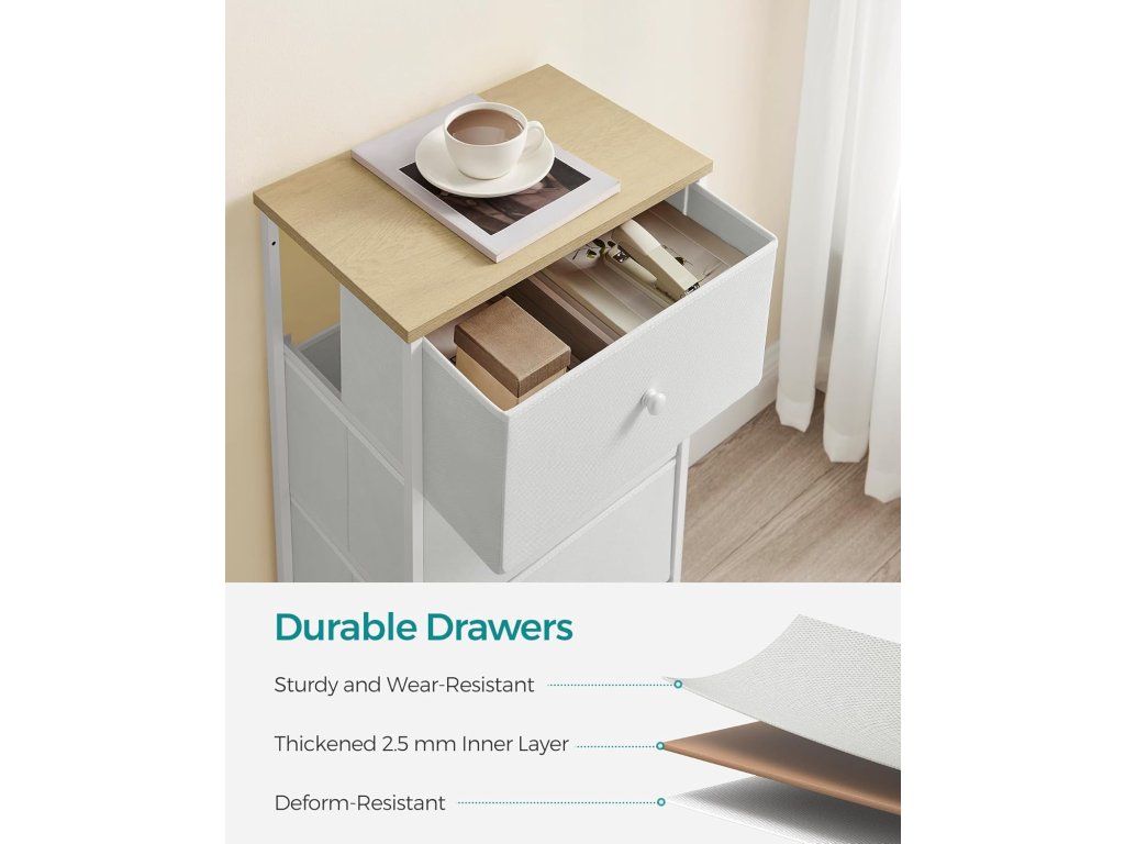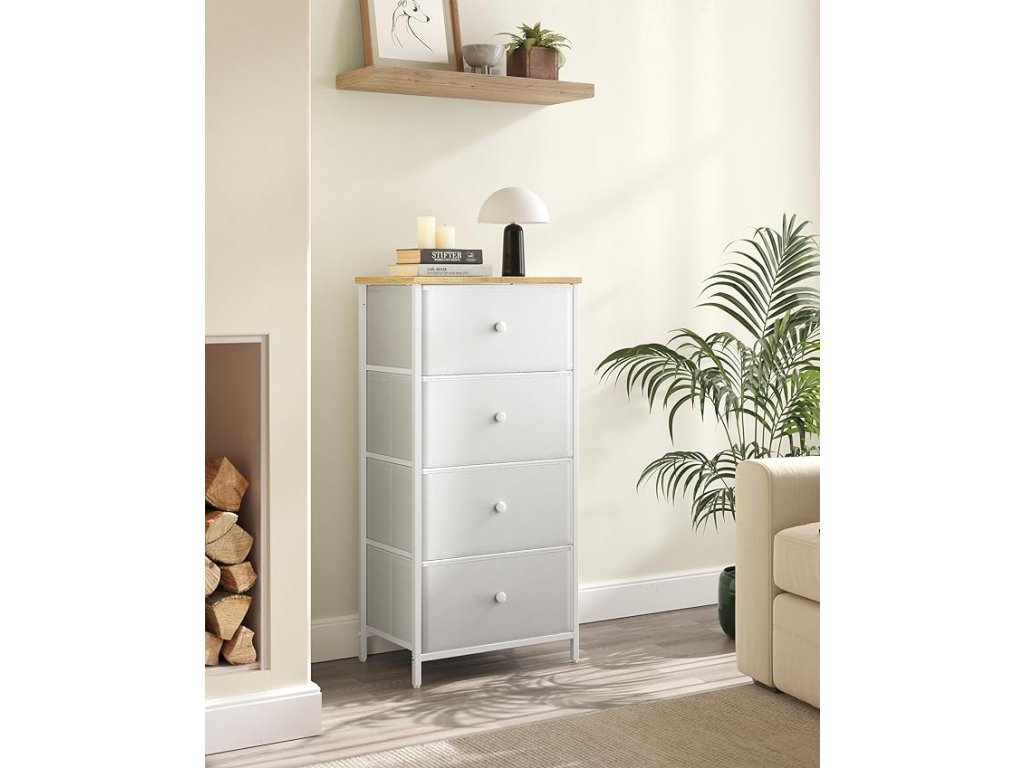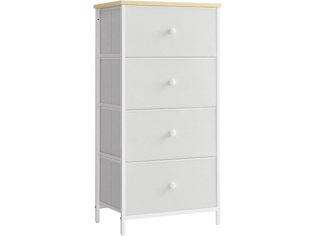 Komoda do ložnice, zásuvková skříňka, komoda se 4 látkovými zásuvkami, kovový rám, vysoká a štíhlá, do skříně, bílá a dub.