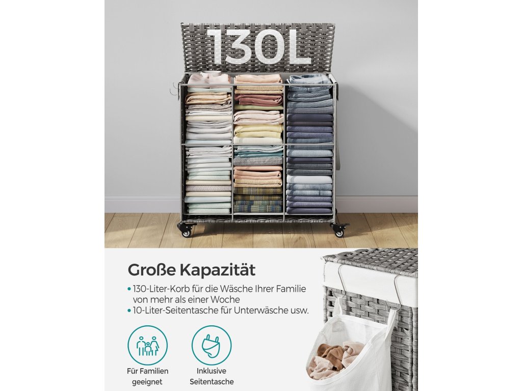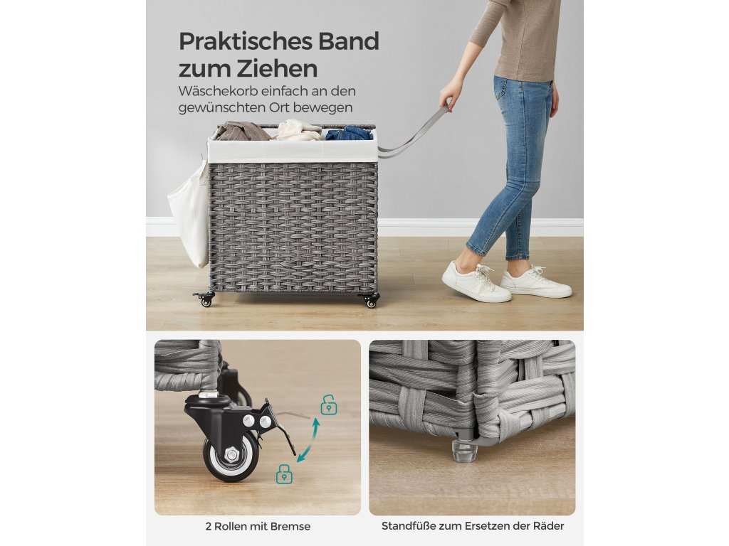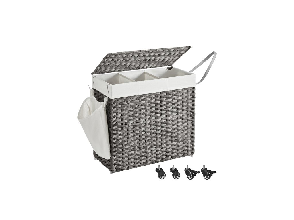 Koš na prádlo, ručně tkaný koš na prádlo, 140l, v ratanovém stylu se 3 přihrádkami, vyjímatelná vložka, madla, víko, 66 x 33 x 60 cm, v šedé barvě.