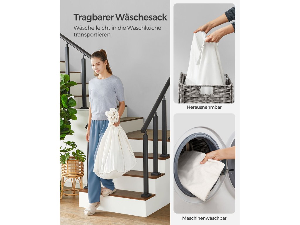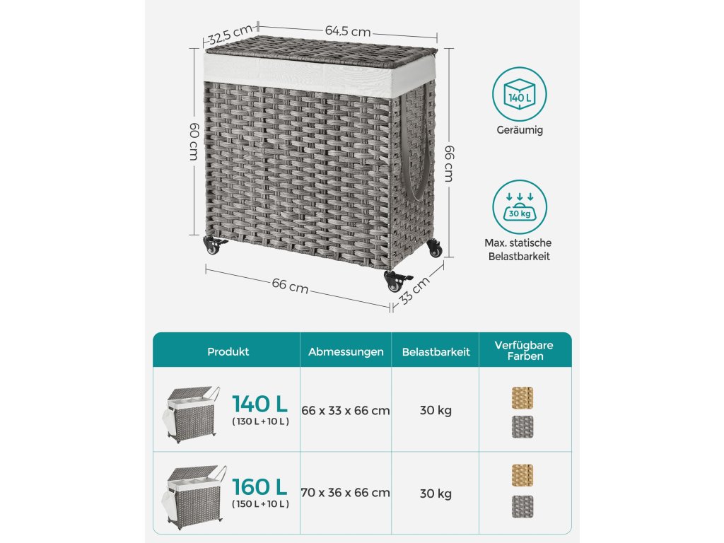 Koš na prádlo s víkem Víko koše na prádlo lze otevřít a zavřít jednou rukou, což usnadňuje zavření víka po vložení prádla dovnitř; víko zabraňuje úniku pachů a chrání oblečení před prachem;Velká kapacita, 3 přihrádky Koš na prádlo má rozměry 66 x 33 x 60 cm a velkou kapacitu 140 l. Tři přihrádky vám pomohou roztřídit světlé, tmavé a choulostivé oblečení pro snadné čištění a skladování.PP ratan a robustní Materiál z PP ratanu je voděodolný a prodyšný, takže oblečení zůstane suché; kovový rám je odolný, stabilní a unese až 30 kg.Vnitřní vak a boční kapsa Vnitřní vak ze 160 g/m² silné bavlny je odnímatelný, takže jej lze snadno přenést do prádelny nebo hodit do pračky; boční kapsa pro uložení spodního prádla;Snadné přemisťování Koš na prádlo má 4 kolečka (2 mají brzdy), takže jej můžete v případě potřeby přemístit nebo udržet na místě, a kolečka lze také nahradit nožičkami; součástí balení je také dlouhá rukojeť na opasek, která umožňuje přenášení;| Kategorie: | Koše na prádlo |