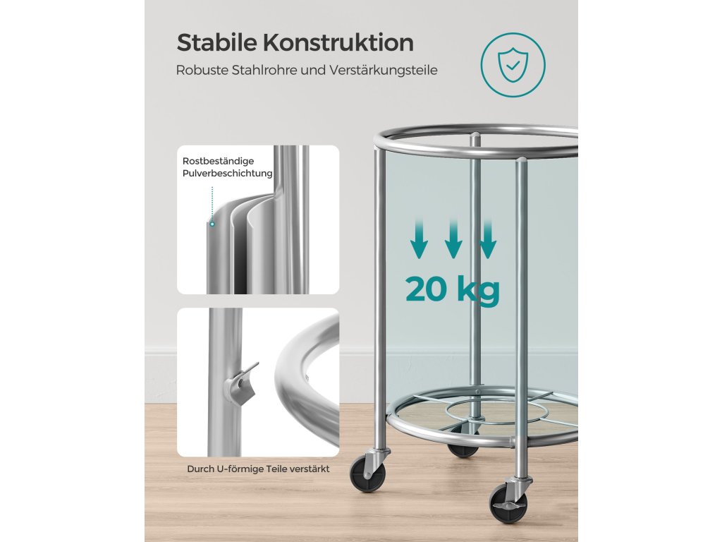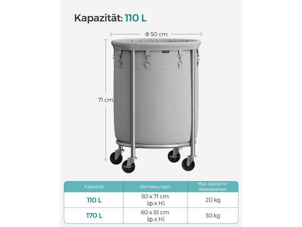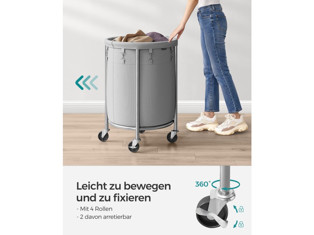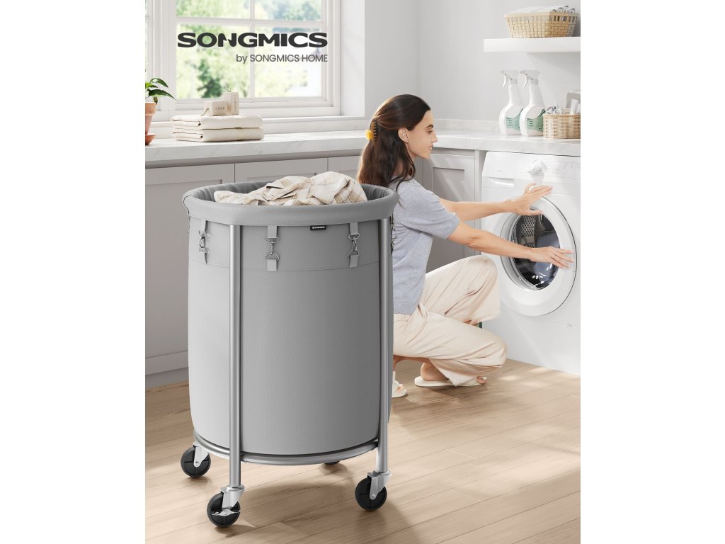 Prostorný koš na prádlo Tento koš na prádlo na kolečkách o rozměrech 50 x 71 cm (šířka x výška) poskytuje 110 l úložného prostoru, což je přibližně týdenní objem prádla pro vaši rodinu.Stabilní a odolný Díky robustním ocelovým trubkám a zesíleným deskám ve tvaru U se tento vozík může pochlubit pevnou konstrukcí, která unese až 20 kg. Díky práškovému lakování jsou trubky odolné proti korozi a mají delší životnost.Robustní taška na prádlo Taška je vyrobena z kvalitní polyesterové tkaniny 600D a uvnitř je potažena PVC, takže je odolná pro dlouhodobé používání. Připojené spony pevně upevňují pytel k ocelovému rámu.Snadné přemisťování a aretace 4 kolečka, z nichž 2 mají brzdy, umožňují snadné přemístění tohoto koše na prádlo do prádelny a jeho aretaci na místě.Snadná montáž Díky očíslovaným dílům a snadnému návodu můžete tento vozík na prádlo sestavit bez námahy během chvilky.| Kategorie: | Koše na prádlo |