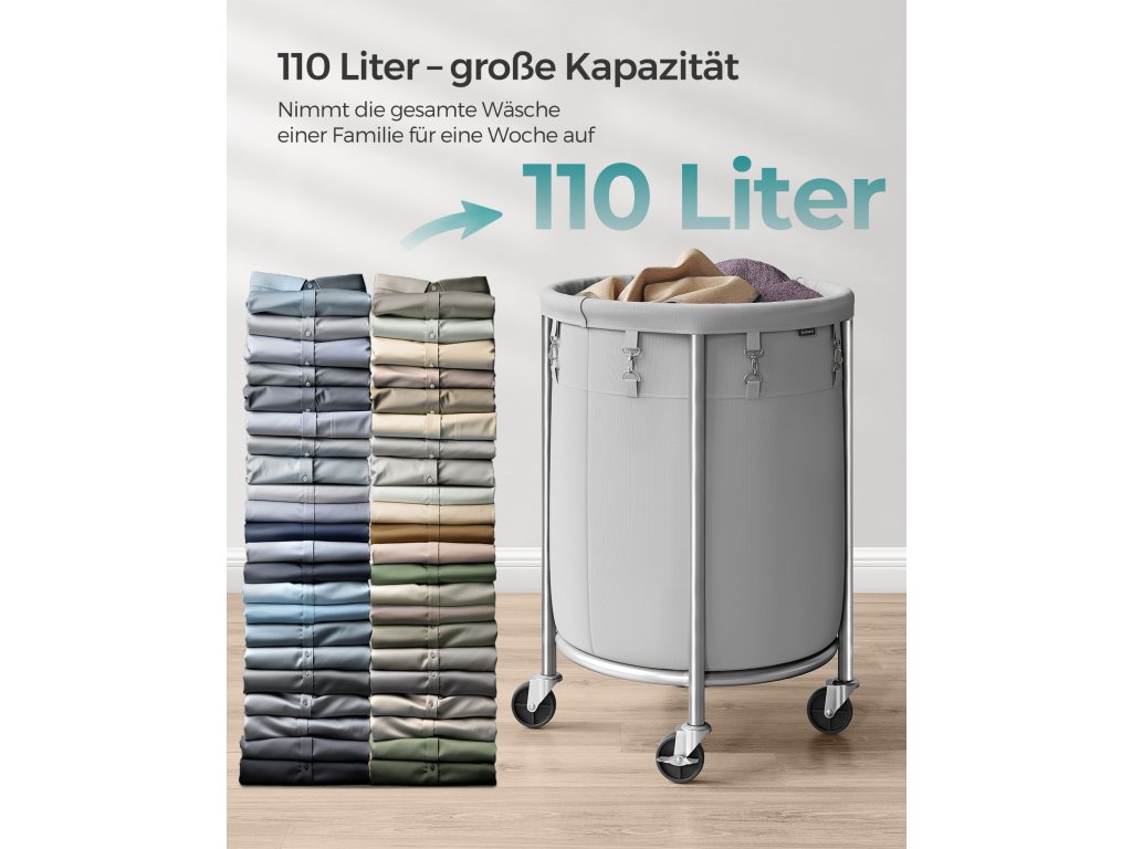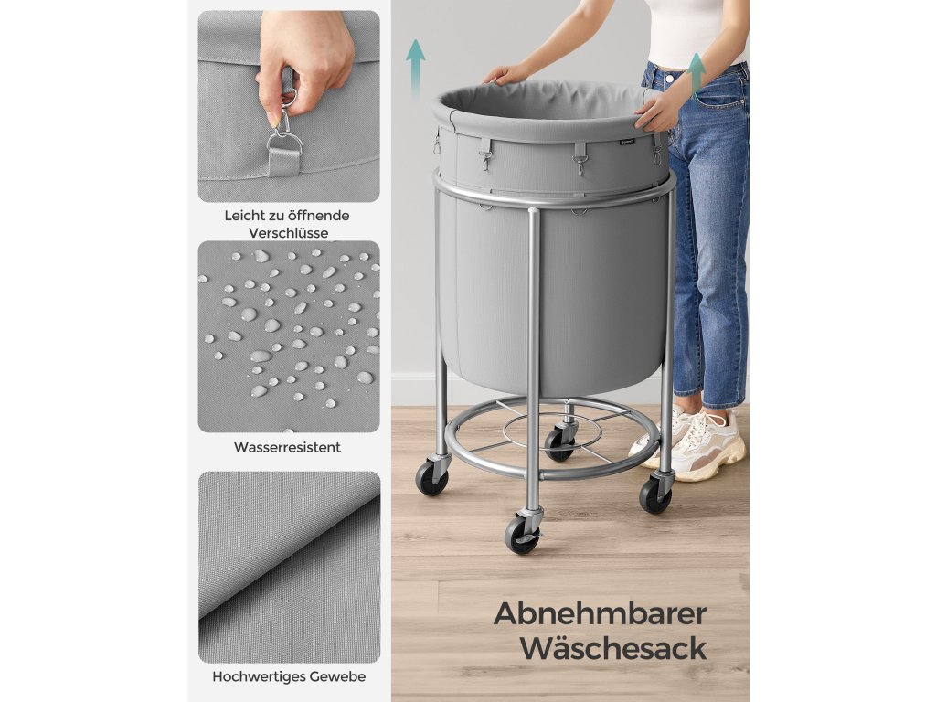 Koš na prádlo na kolečkách, vozík na prádlo 110 l, kulatý koš na prádlo s ocelovým rámem a vyjímatelným vakem, 4 kolečka a 2 brzdy, šedá a stříbrná.