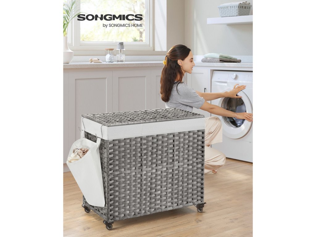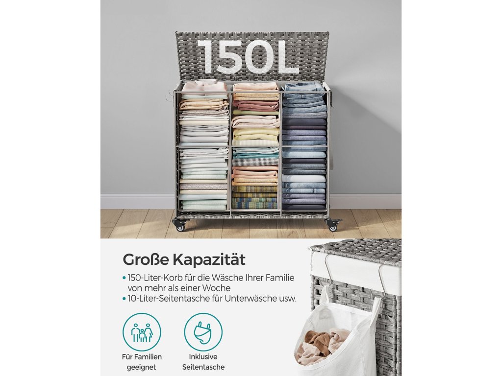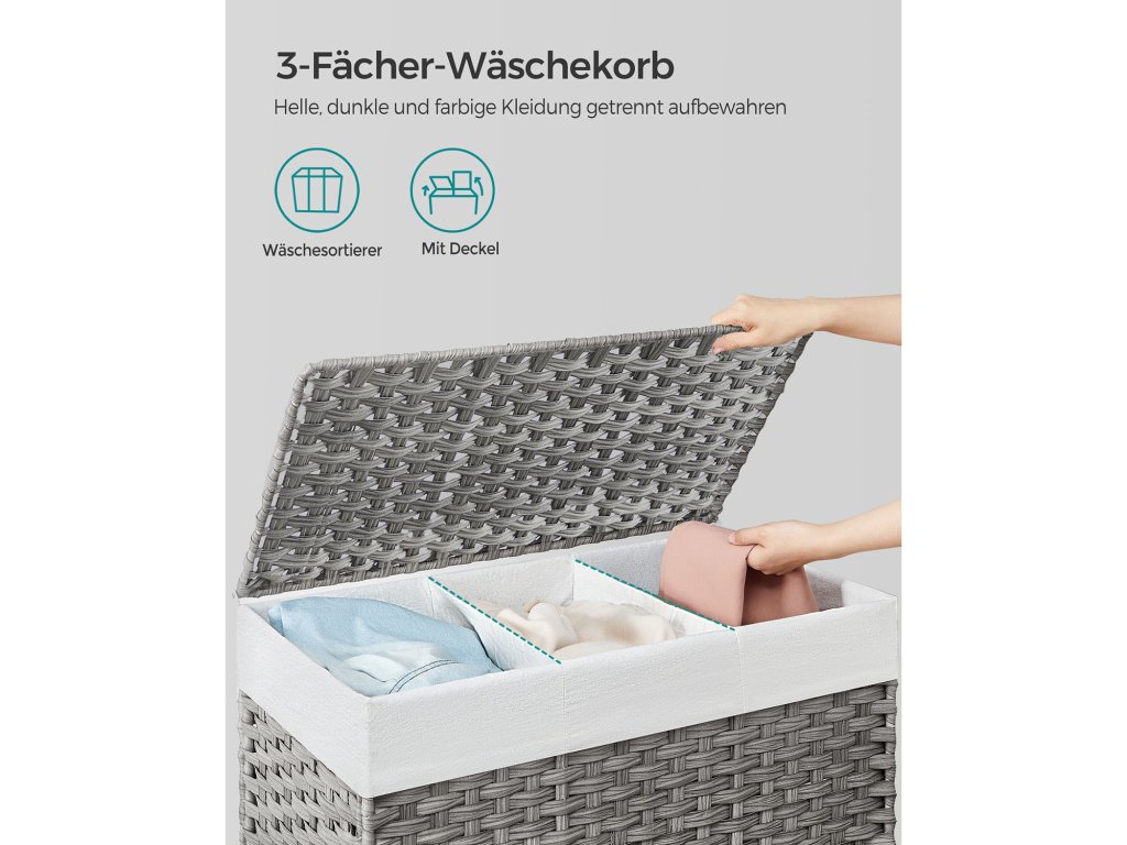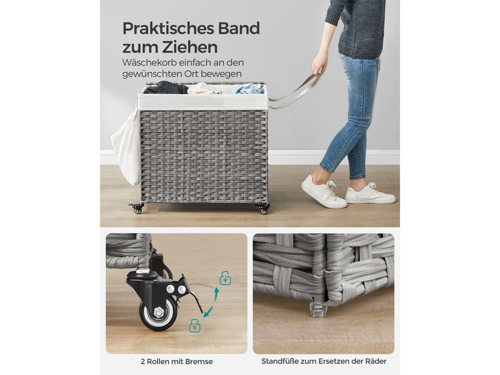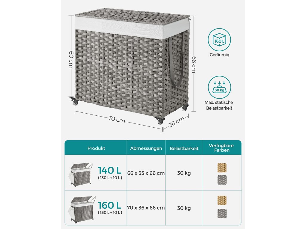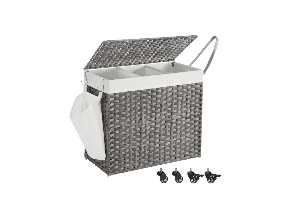 Koš na prádlo s víkem, 160 l, koš na prádlo, 3 přihrádky, třídič prádla s kolečky, ratanový vzhled, taška na prádlo, vyjímatelná, do prádelny, 70 x 36 x 66 cm, šedá.