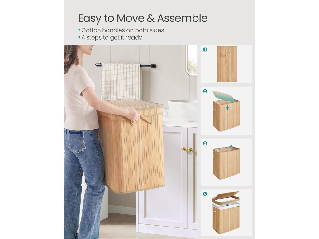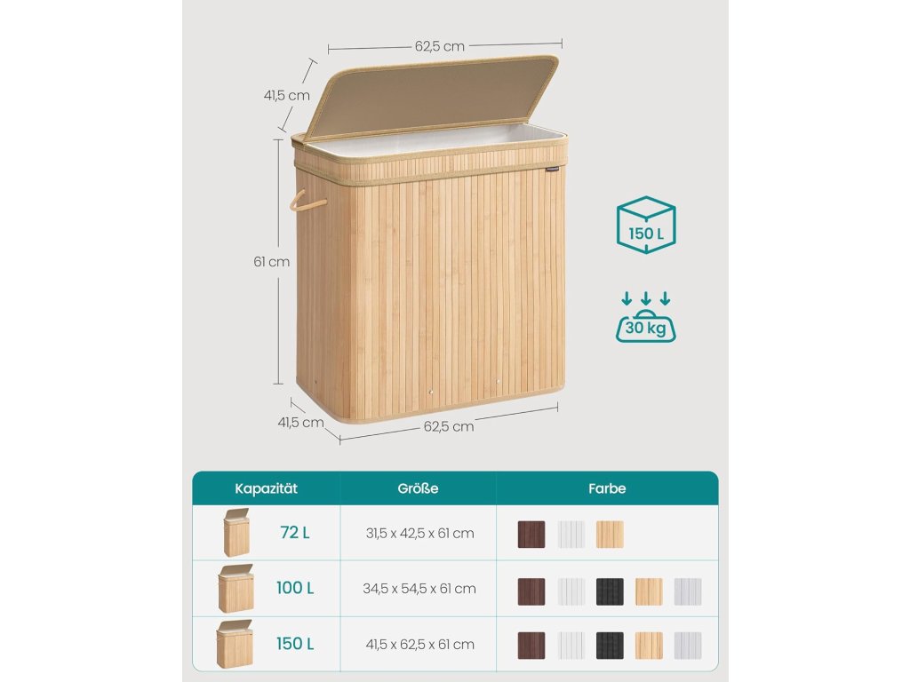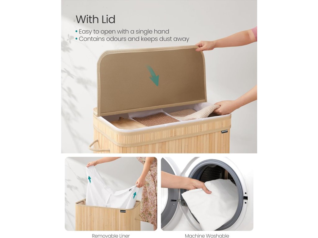 Koš na prádlo s víkem Víko lze snadno otevřít jednou rukou, takže do něj můžete bez námahy vložit všechno prádlo včetně přikrývek, polštářů a ručníků. Zavřete víko, abyste je skryli a ochránili před prachem.Velká kapacita 150 l Tento koš na prádlo má rozměry 41,5 x 62,5 x 61 cm a velkorysou kapacitu 150 l, takže do něj můžete uložit prádlo na celý týden.Robustní a skládací Tento koš na prádlo, vyrobený z bambusových lamel o šířce 17 mm a podepřený kovovým rámem, je stabilní a pevný a unese až 30 kg. Jeho jednoduchá konstrukce umožňuje snadné složení na plocho, když se nepoužívá.Vyjímatelná a v pračce pratelná vnitřní vložka Vnitřní vložka z husté bavlny o hmotnosti 160 g/m² je vyjímatelná a lze ji prát v pračce, takže se snadno udržuje v čistotě a v den praní ji lze vzít do prádelny.Snadné přemístění a sestavení Bavlněná lana na obou stranách koše umožňují jeho snadné přemístění. Díky jasným pokynům a označeným dílům je sestavení tohoto koše na prádlo hračkou.| Kategorie: | Koše na prádlo |