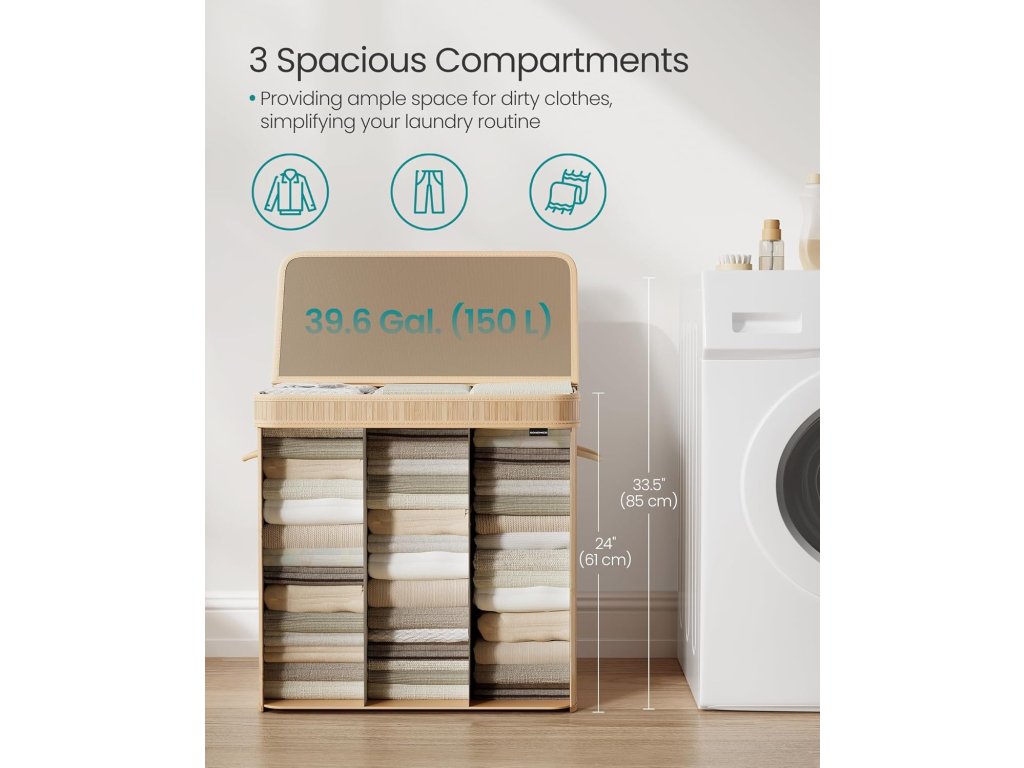 Koš na prádlo s víkem, bambusový koš na prádlo, vyjímatelný koš na prádlo, který lze prát v pračce, s uchy, 150 l, do prádelny, ložnice, koupelny, přírodní béžová.