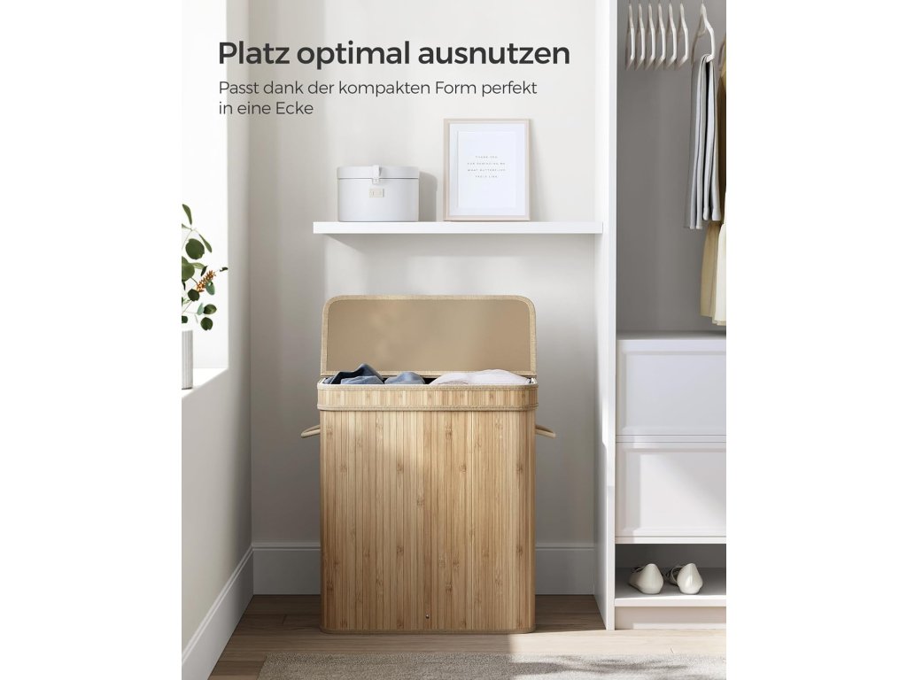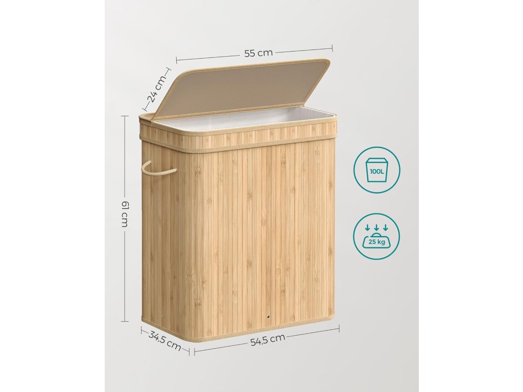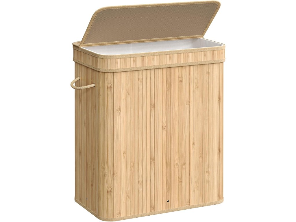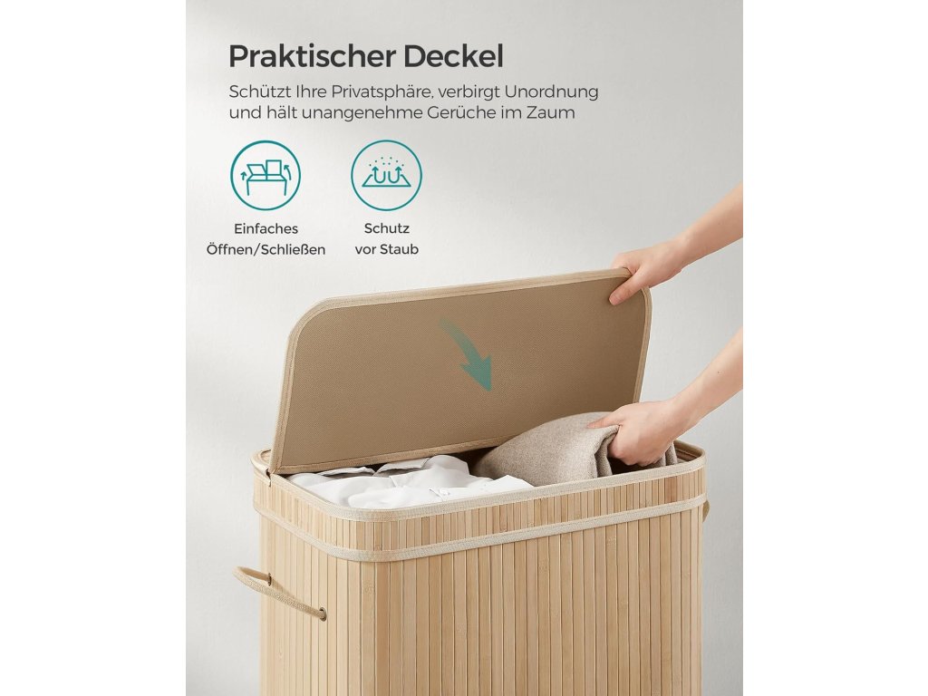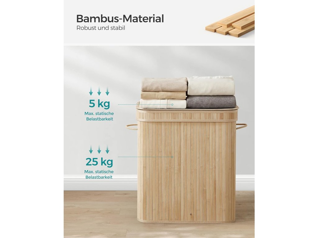 Stabilní a skládací: Tento box na prádlo je vyroben z bambusových lamel o šířce 17 mm a je podepřen kovovým rámem, je stabilní, robustní a unese až 25 kg; díky jednoduché konstrukci ji lze snadno složit, když se nepoužívá;Sáček na prádlo je vyjímatelný a lze jej prát v pračce Vnitřní sáček ze směsové polybavlněné tkaniny 160 GSM je vyjímatelný a lze jej prát v pračce. umožňuje snadné přenášení prádla do prádelny v den praní.| Kategorie: | Koše na prádlo |