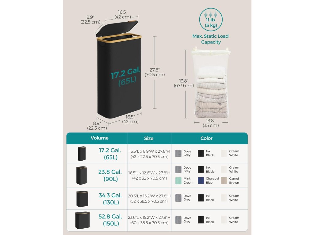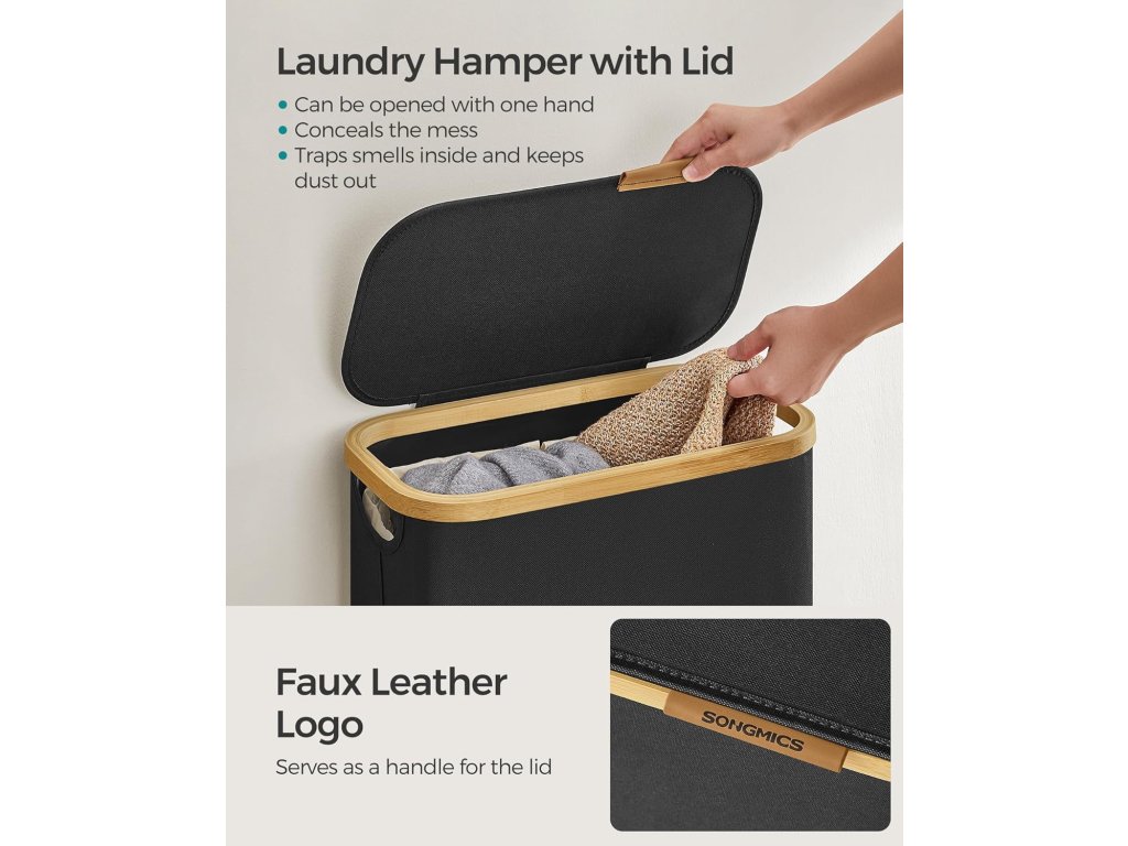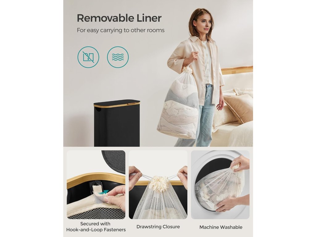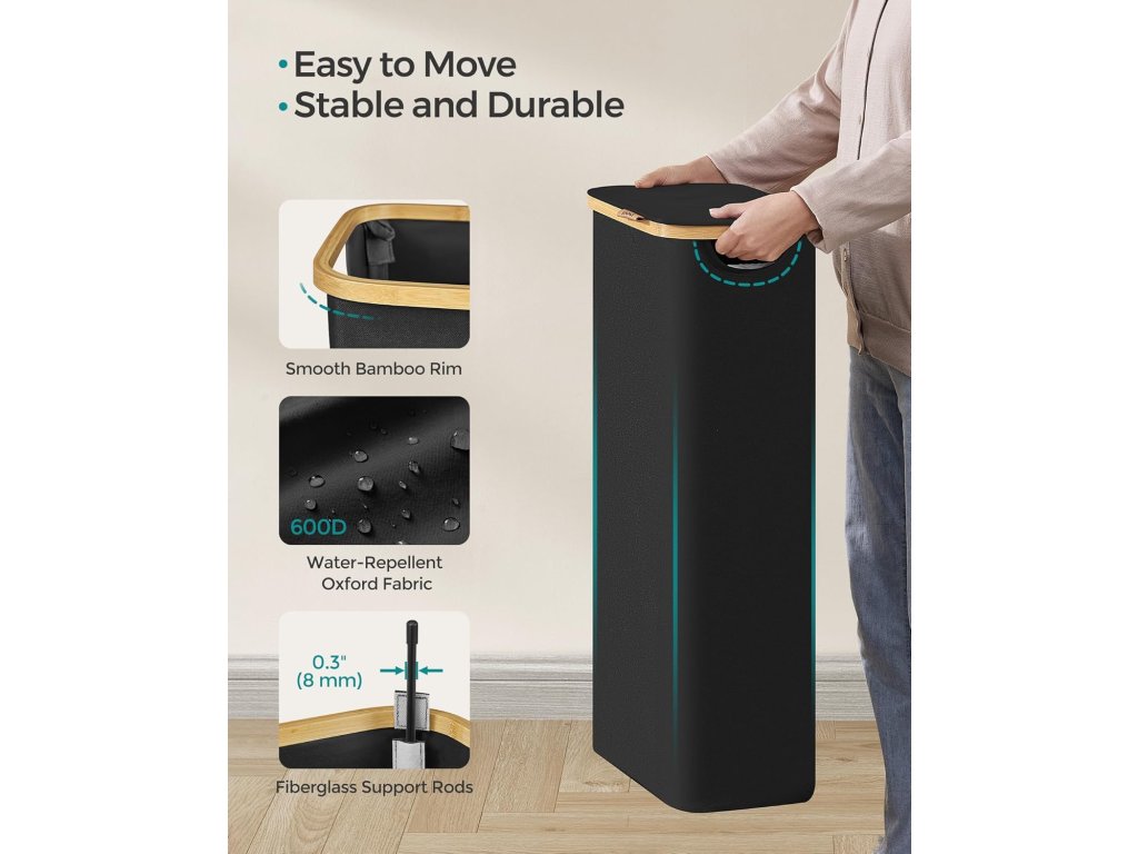 Prostorný Tento úzký koš na prádlo o objemu 65 l a rozměrech 42 x 22,5 x 70,5 cm je speciálně navržen tak, aby se vešel do úzkých prostor. je to ideální koš na prádlo do malých obytných prostor nebo kompaktních prádelen.Pohodlné víko s rukojetí Koš na prádlo je vybaven víkem, které nejen zabraňuje usazování prachu, ale také chrání soukromí tím, že zakrývá nepořádek. Logo z umělé kůže na víku slouží jako držadlo pro snadné otevírání a dodává mu eleganci.Odnímatelná a všestranná vložka Vložku, upevněnou pomocí suchých zipů, lze snadno vyjmout a její šňůrky slouží jako držadla pro pohodlné přenášení. Díky síťované konstrukci může sloužit jako prací pytel pro tříděné praní v pračce.Odolný a robustní Koš na prádlo je vyroben ze silné tkaniny Oxford 600D, která je odolná proti vodě, roztržení a snadno se čistí. Její vnitřní struktura podepřená tyčemi ze skleněných vláken zajišťuje stabilitu při pravidelném používání.Snadná montáž Díky jasným pokynům a bez použití nářadí můžete tento koš na prádlo snadno postavit za pouhých 5 minut.| Kategorie: | Koše na prádlo |