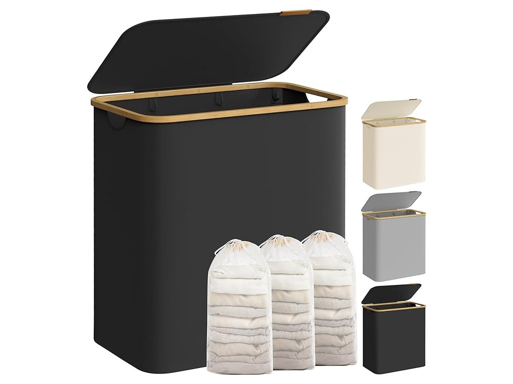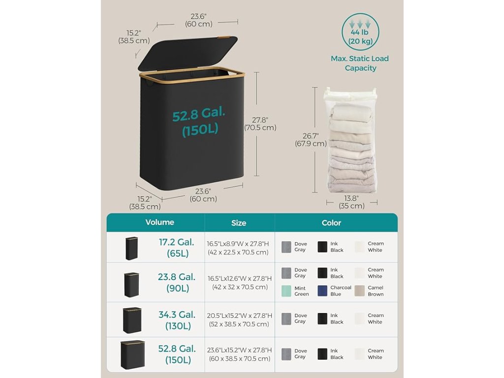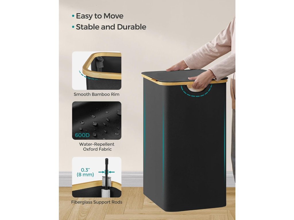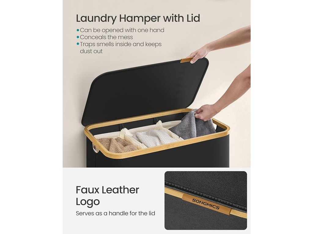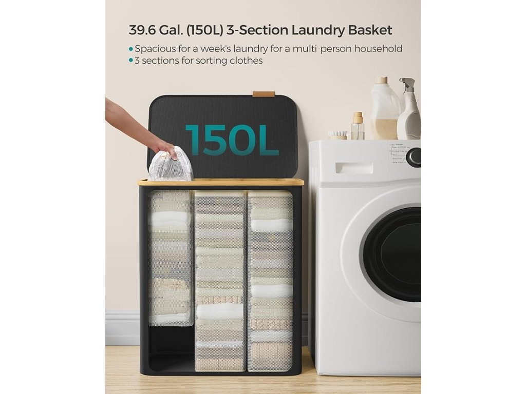 Koš na prádlo s víkem, třídílný velký koš na prádlo, 150 l, vyjímatelná síťová vložka, tkanina Oxford, bambusové rukojeti, skládací, 60 x 38,5 x 70,5 cm, inkoustově černý.
