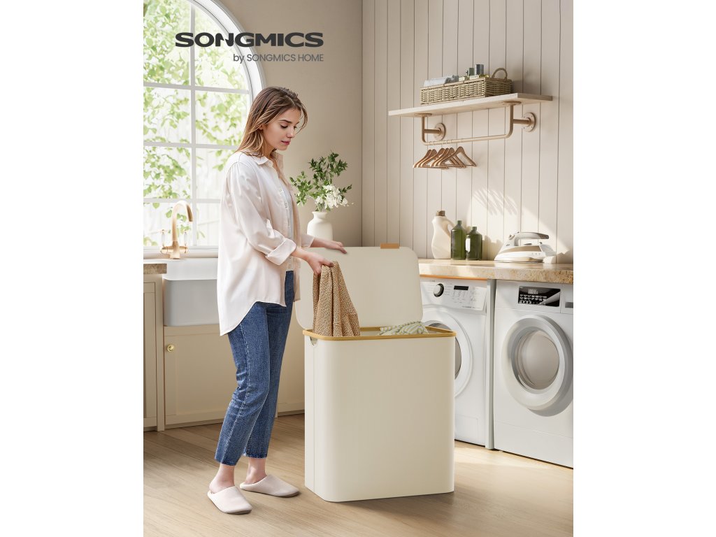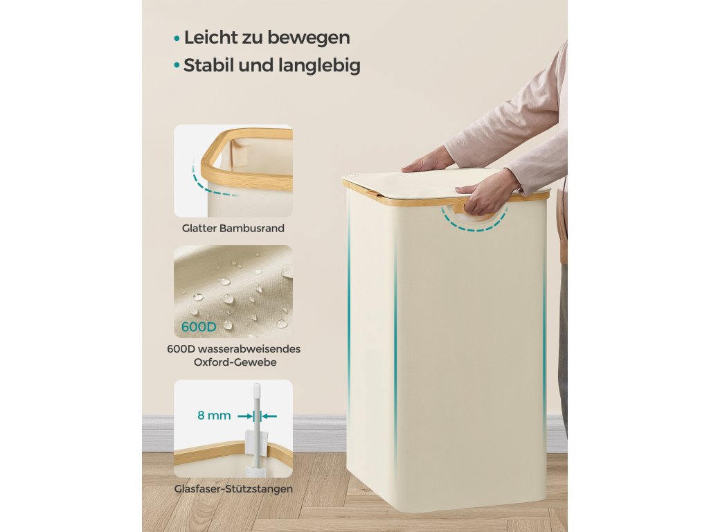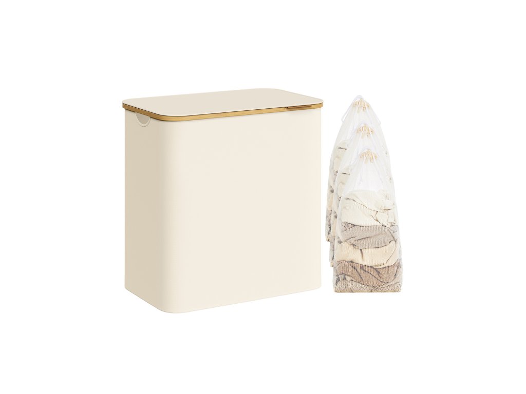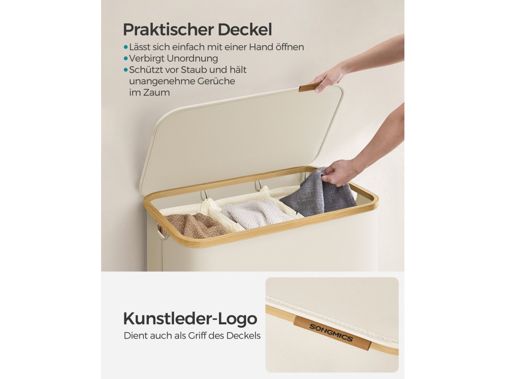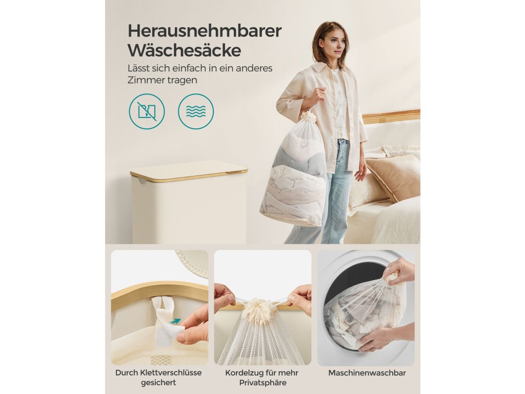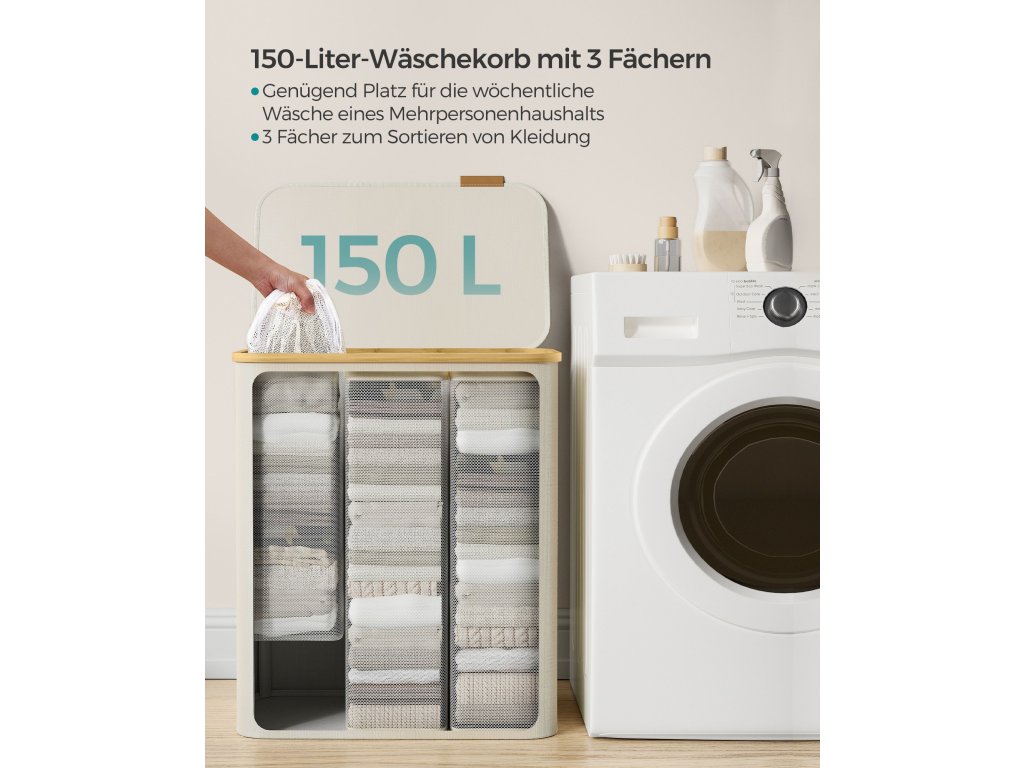 Koš na prádlo s víkem, třídílný velký koš na prádlo, 52,8 galonu (150 l), vyjímatelná síťová vložka, bambusové rukojeti, skládací, 23,6 x 15,2 x 27,8 palce, krémově bílý.