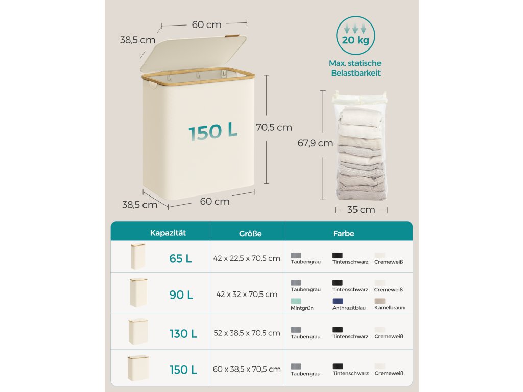 3 prostorné přihrádky Tento koš na prádlo o objemu 52,8 galonu (150 l), rozměrech 23,6 "D x 15,2 "Š x 27,8 "V a se 3 přihrádkami. je dokonale navržen pro třídění a skladování oblečení pro vícečlennou rodinu, což vám usnadní praní prádla.Pohodlné víko s rukojetí Koš na prádlo je vybaven víkem, které nejen zabraňuje usazování prachu, ale také chrání soukromí tím, že zakrývá nepořádek. Logo z umělé kůže na víku slouží jako držadlo pro snadné otevírání a dodává mu eleganci.Odnímatelné a univerzální vložky Vložky, které jsou upevněny pomocí háčků a smyček, lze snadno vyjmout a jejich šňůrky slouží jako držadla pro pohodlné přenášení. Díky síťované konstrukci může sloužit jako prací pytel pro tříděné praní v pračce.Odolný a stabilní Tento koš na prádlo je vyroben z tkaniny 600D Oxford, je odolný proti vodě, roztržení a snadno se čistí. Jeho konstrukce vylepšená tyčemi ze skelných vláken zajišťuje každodenní stabilitu.Rychlá montáž a skládání Tento koš na prádlo sestavíte za 5 minut podle jasných pokynů, není třeba žádné nářadí. Když jej nepoužíváte, můžete jej složit pro kompaktní skladování| Kategorie: | Koše na prádlo |