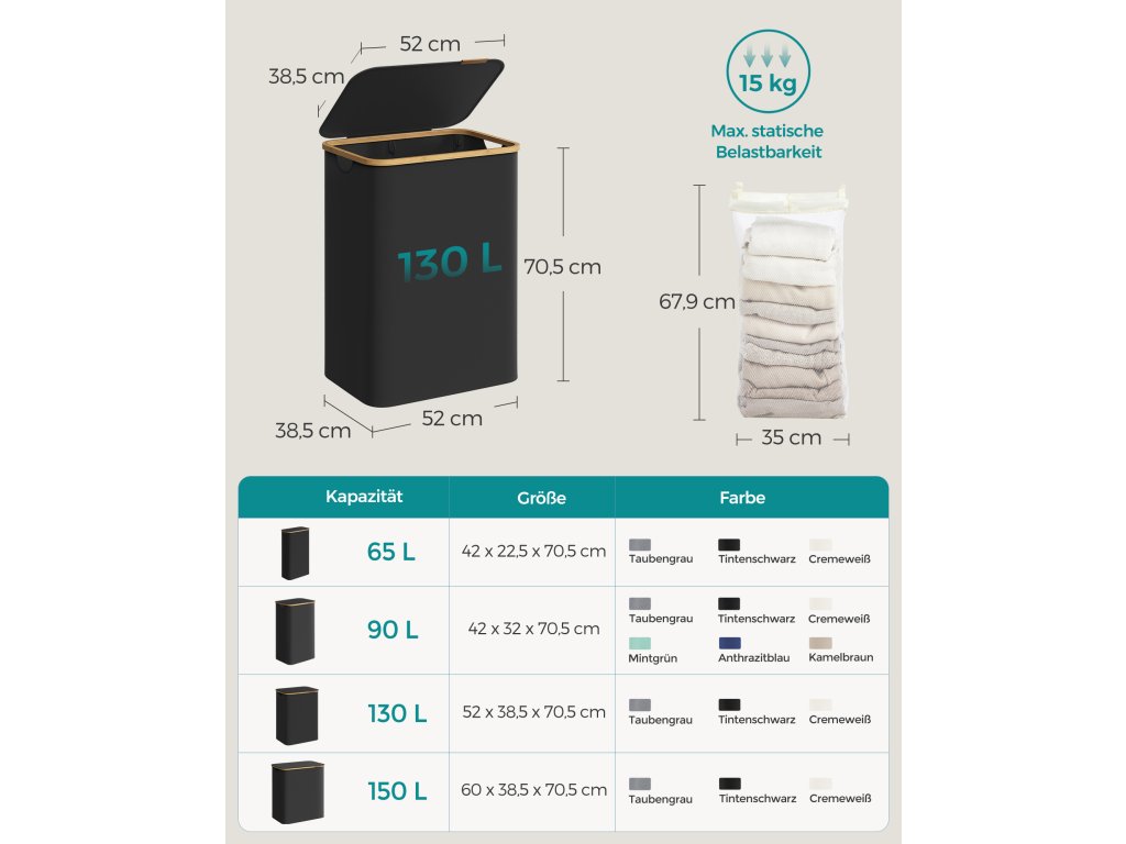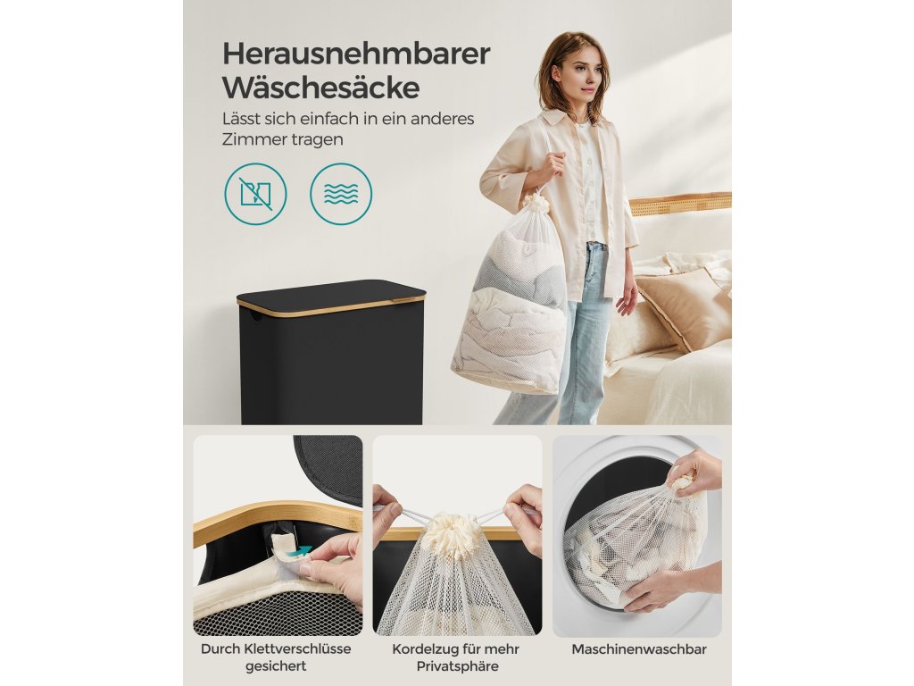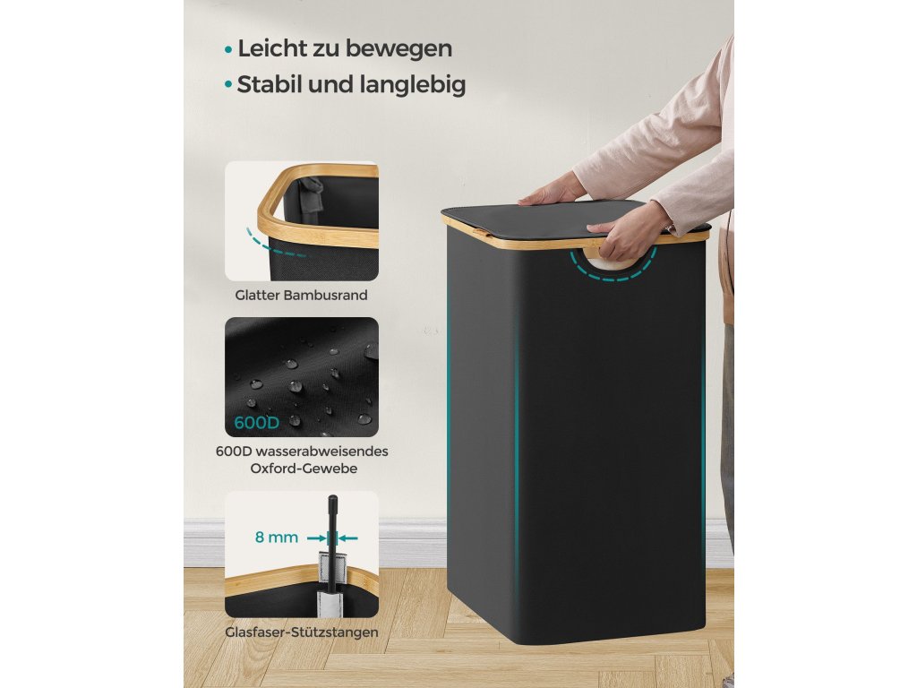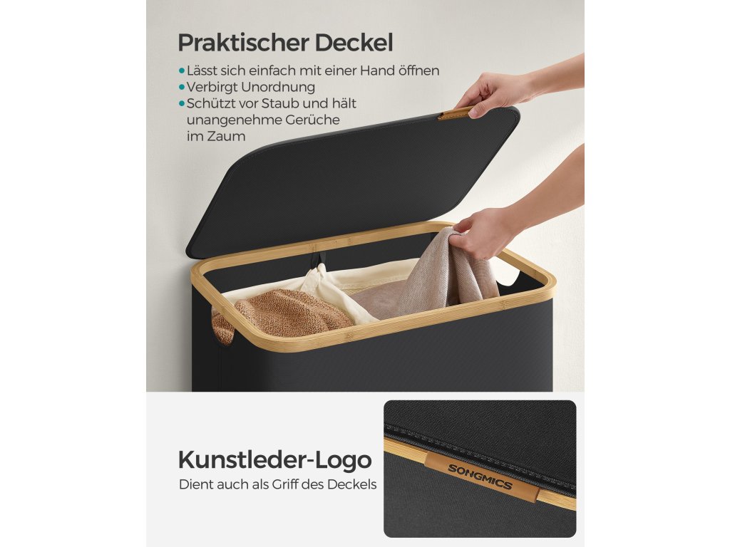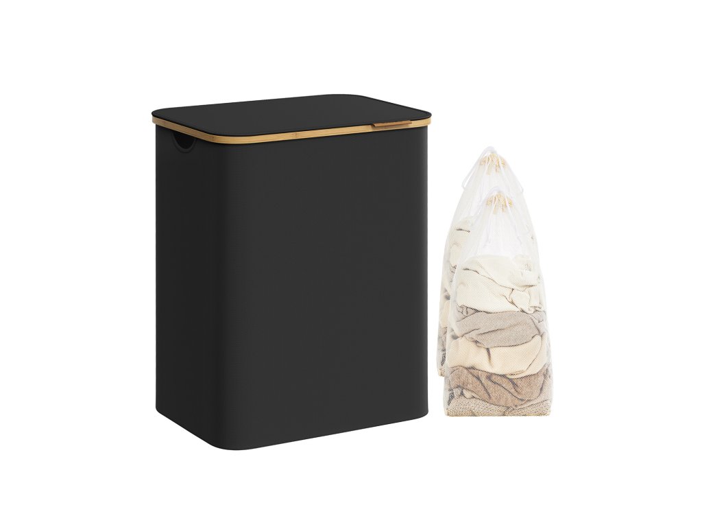 Koš na prádlo s víkem, velký koš na prádlo se dvěma částmi, 130 l, vyjímatelná síťová vložka, tkanina Oxford, bambusové rukojeti, skládací, 52 x 38,5 x 70,5 cm, inkoustově černý.