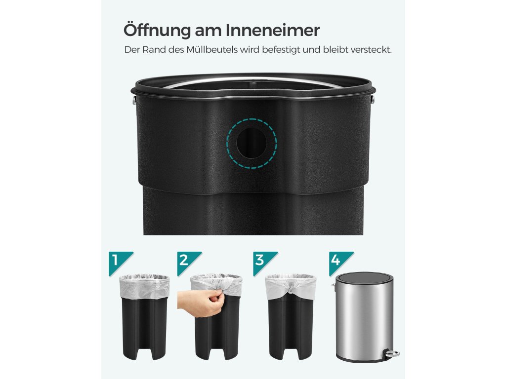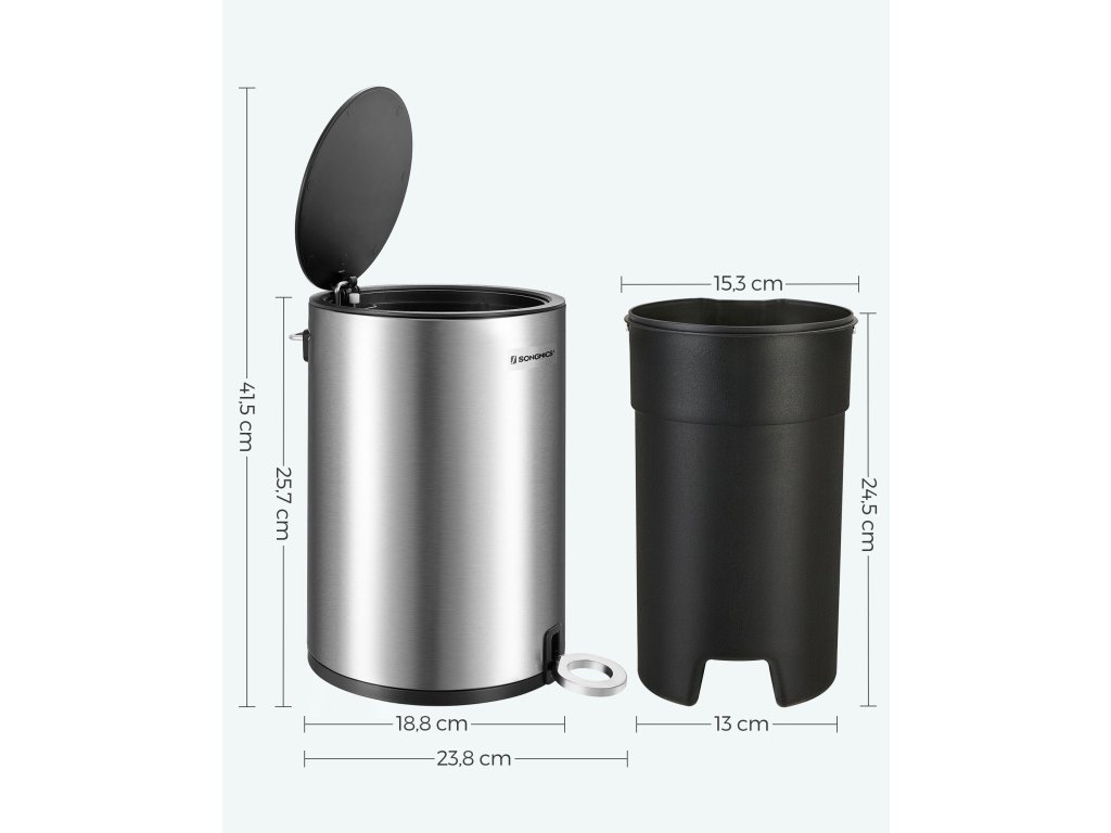Úspora místa a styl: Tento kosmetický koš o objemu 3 litry se skvěle hodí do vaší koupelny. Pomůže vám vyhodit každodenní odpad (např. použité kosmetické ubrousky) a dokonale se hodí k ostatnímu koupelnovému nábytku.Víko s tichým zavíráním: Koupelnový koš je vybaven tlumičem, takže se víko nezavírá prudce, ale jemně, pomalu a tiše.Ocelový vnější kontejner: Vnější kontejner malého koše je vyroben z oceli a je robustní a rozměrově stabilní. Povrch je opatřen povrchovou úpravou a snadno se čistí.Odnímatelný vnitřní kbelík: Vnitřní plastový kbelík je vybaven rukojetí, takže jej můžete snadno vyjmout z koupelnového koše a vyhodit odpad.Nožní pedál a otvor pro pytle na odpadky: Pro otevření víka koupelnového koše stačí sešlápnout pedál - bez použití rukou, což je praktické a hygienické. Otvor na vnitřním koši umožňuje připevnit okraj vložky koše.| Kategorie: | Odpadkové koše |