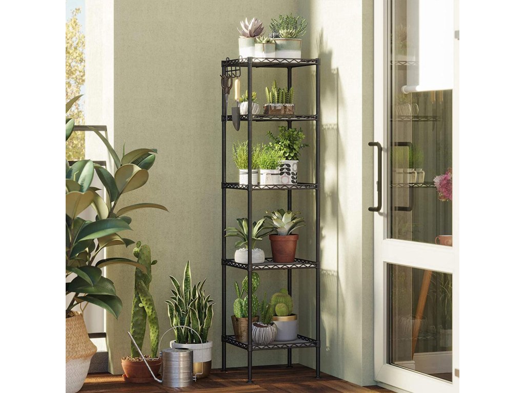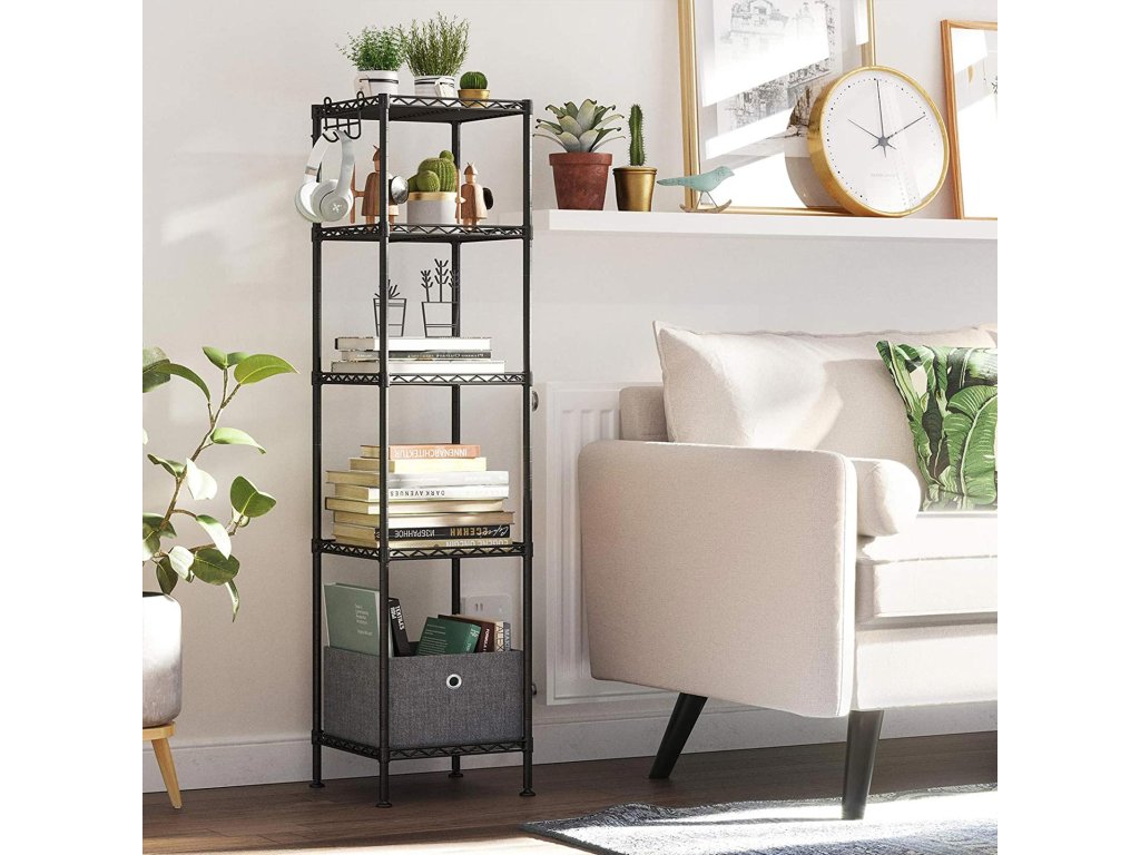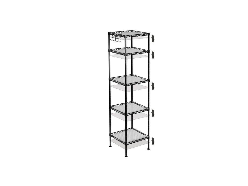 Koupelnová polička, kovový úložný regál, celková nosnost 100 kg, s 5 PP listy, odnímatelné háčky, 30 x 30 x 123,5 cm, rozšiřitelný design, pro malé prostory, černá a průsvitná.