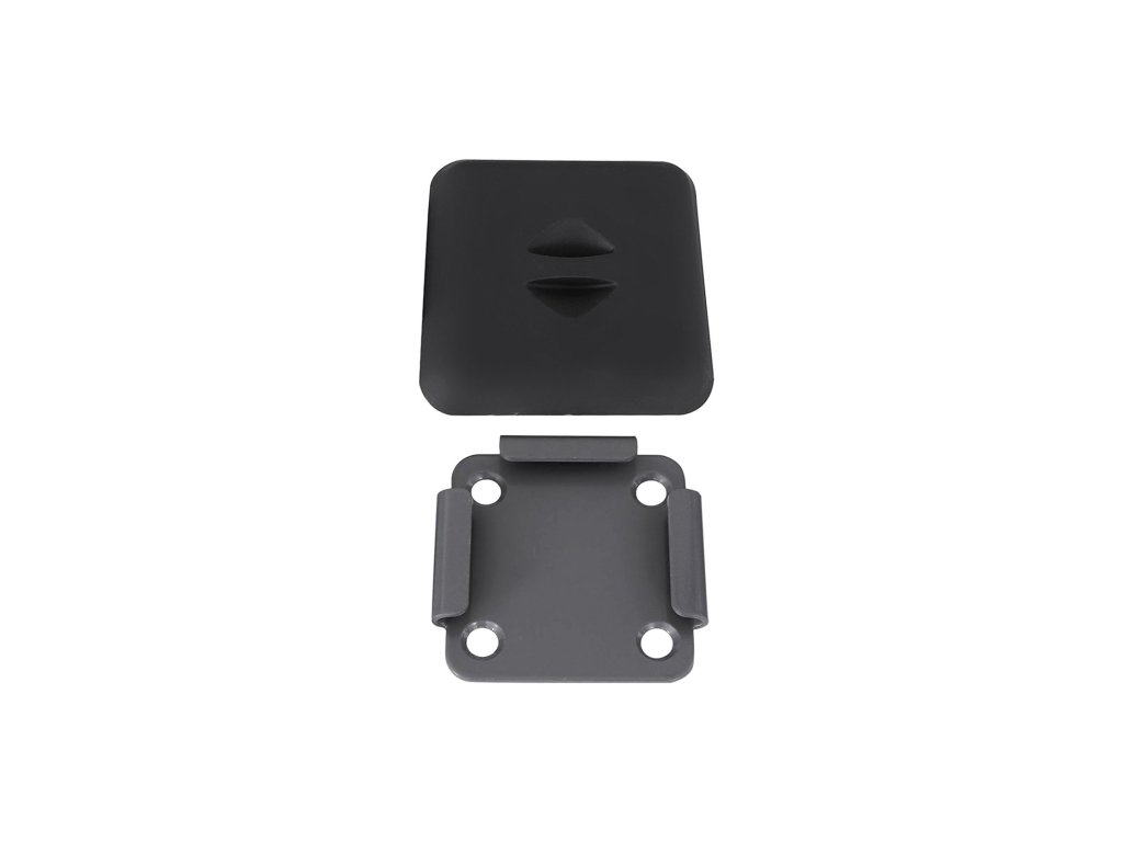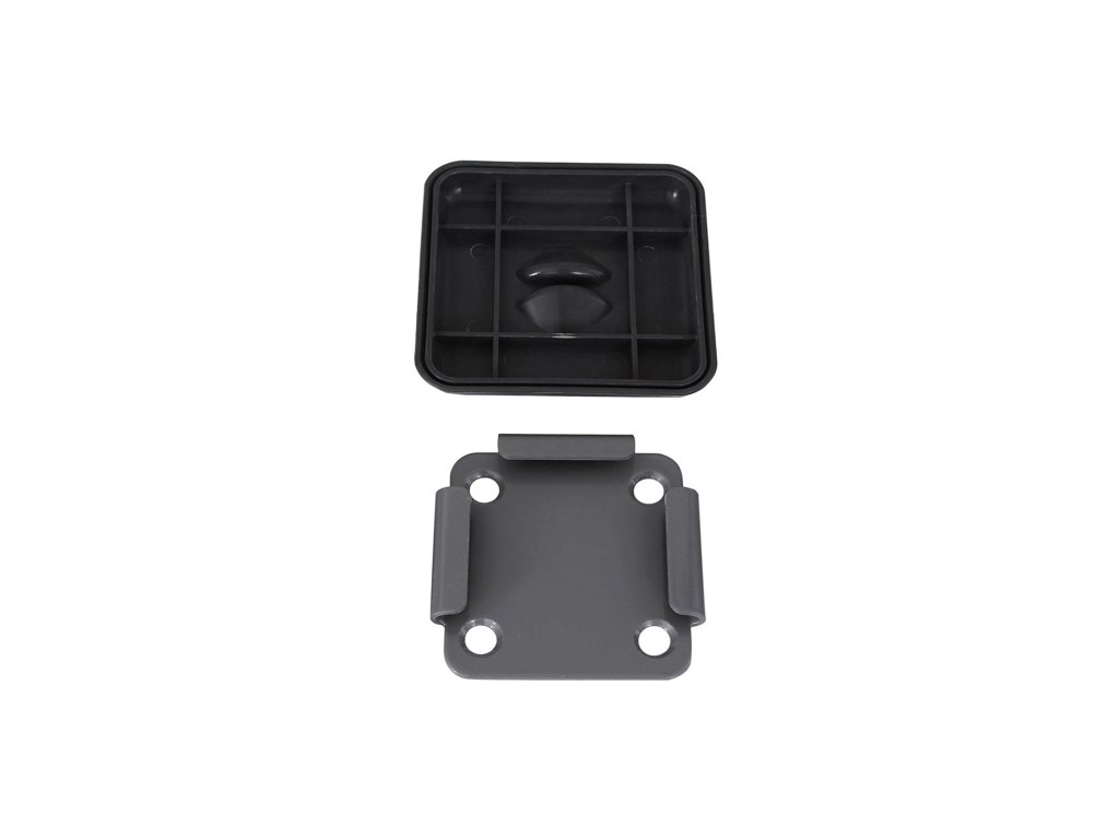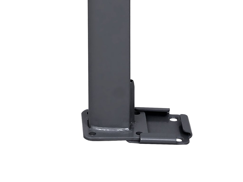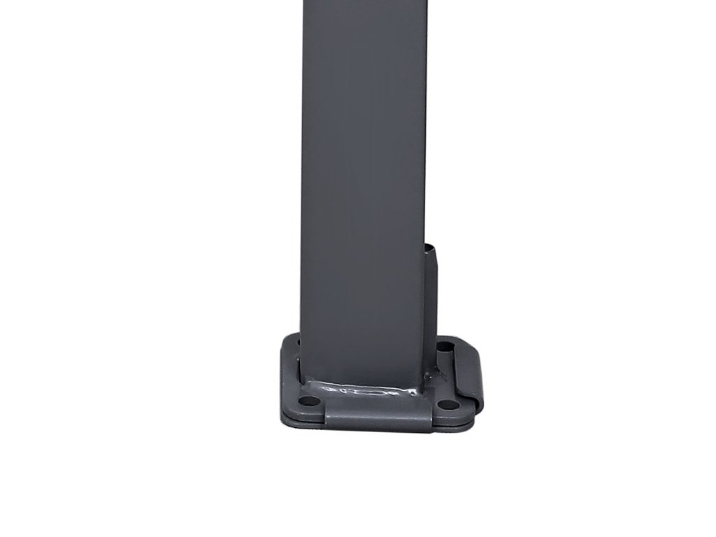Kovová základní deska pro nosný sloupek kovové markýzy s plastovým krytem.