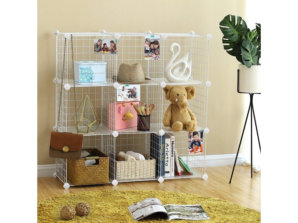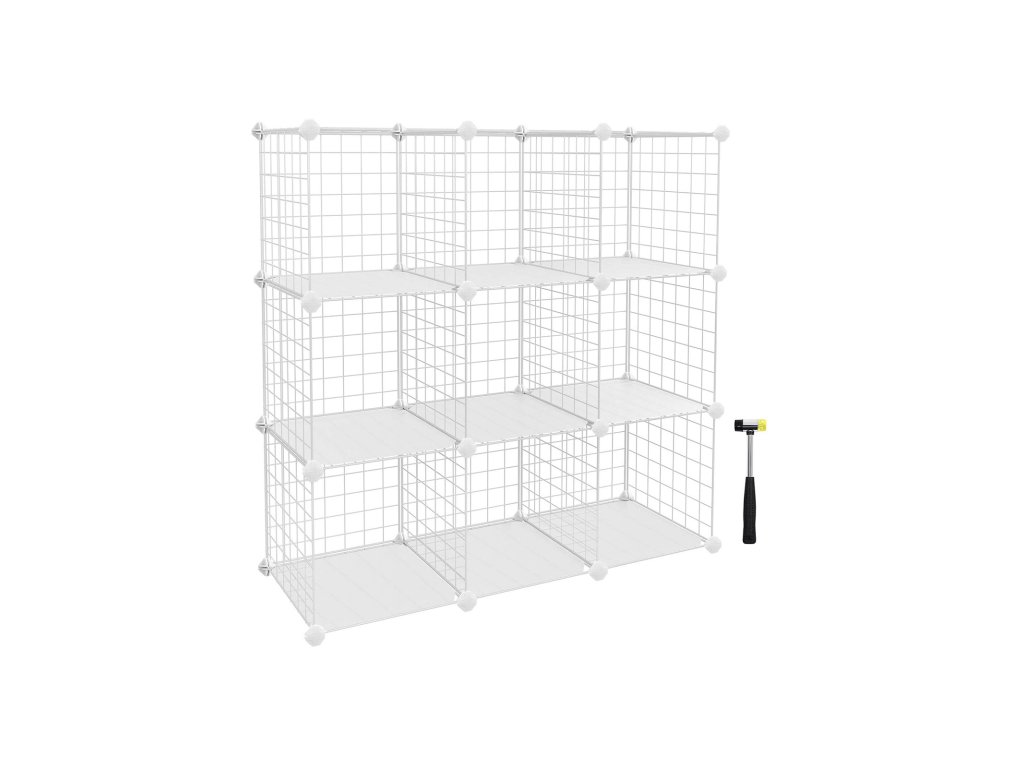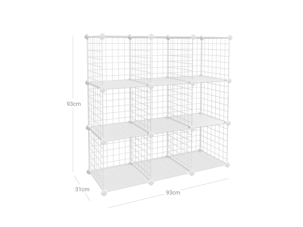 Kovový drátěný úložný regál s 9 kostkami, propojovací regál s kovovými drátěnými policemi, PP plastové desky na knihy boty hračky oblečení nářadí, v obývacím pokoji, 93 x 31 x 93 cm, bílý.