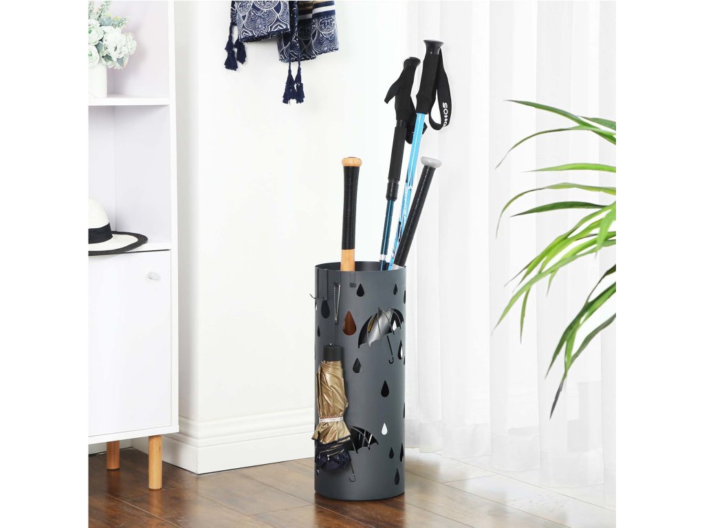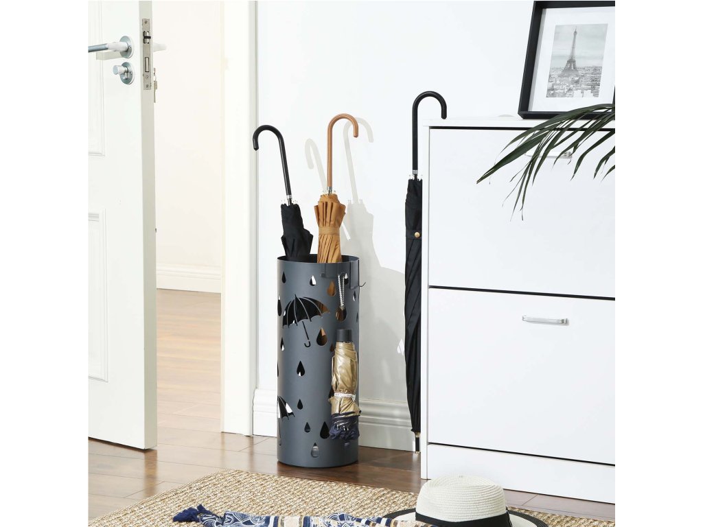 Kovový stojan na deštníky, držák na deštníky s vaničkou na vodu a háčky, 19,5 x 49 cm (průměr x výška), kulatý, matná antracitově šedá.
