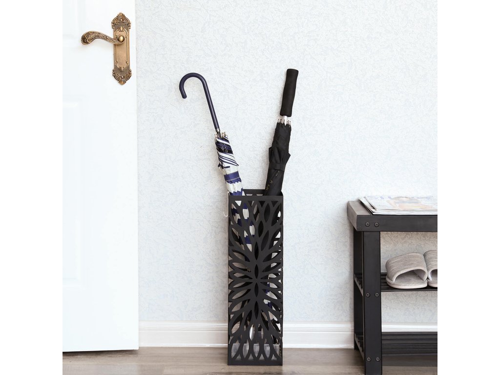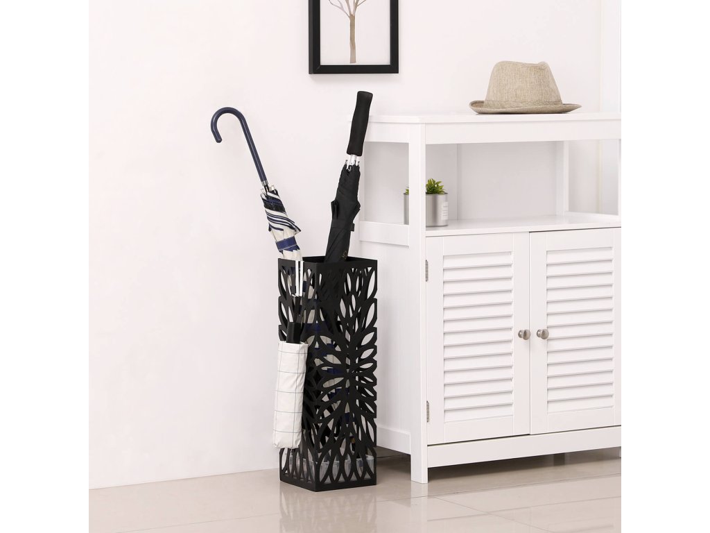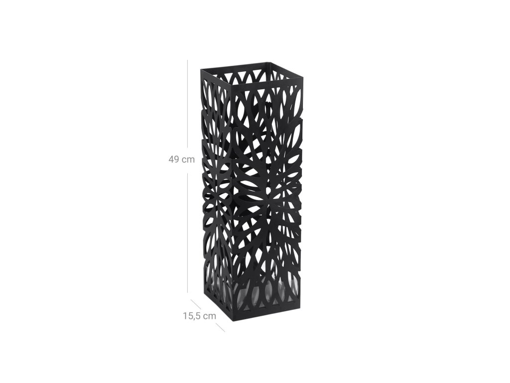 Kovový stojan na deštníky, moderní čtvercový držák na deštníky, 15,5 x 15,5 x 49 cm, se 4 háčky a odnímatelným odkapávačem, do předsíně, kanceláře, černý.