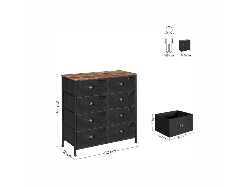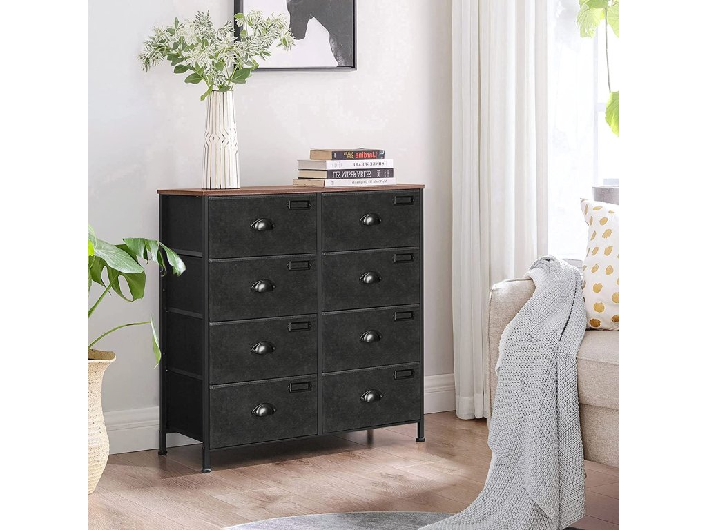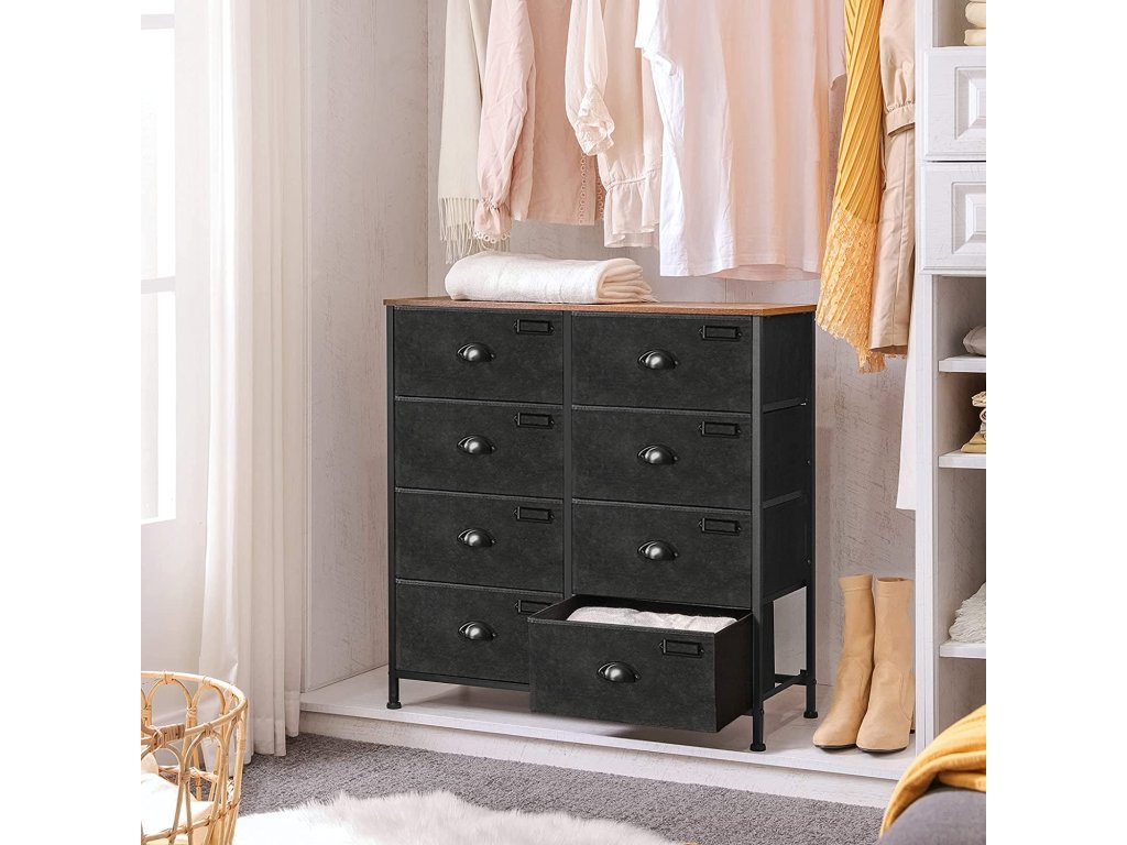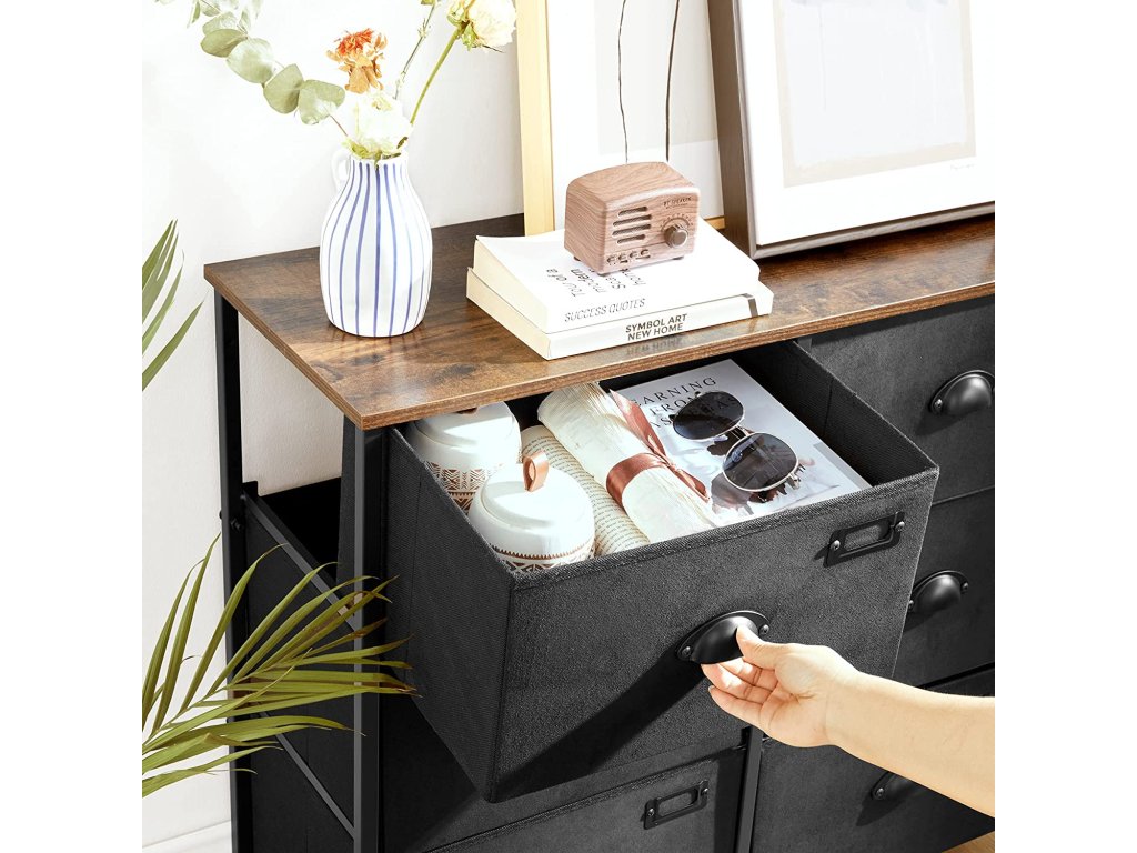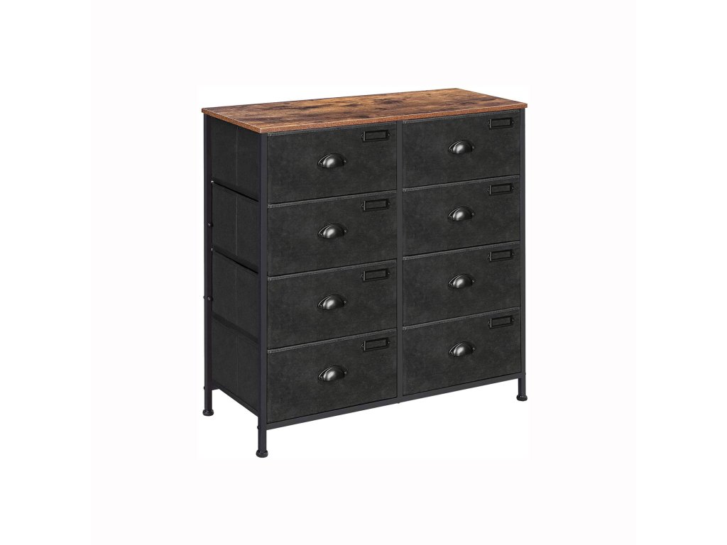 Látková komoda, úložná zásuvková věž, komoda s 8 zásuvkami do ložnice, skříň, obývací pokoj, kovový rám, průmyslová, rustikální hnědá a černá.