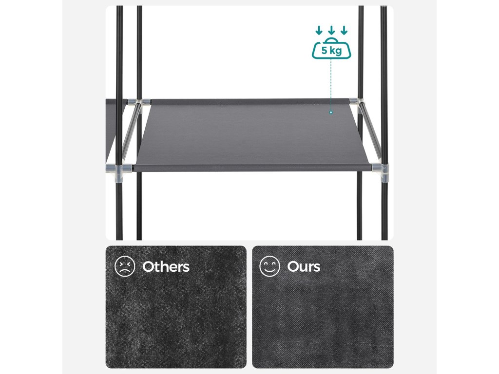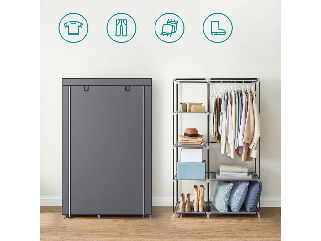 Začněte každý den správně Vezměte si z věšáku košili, kalhoty, ponožky. a klobouky z poliček - příprava je tak snadná, když máte tuto látkovou skříň, kde je vše na jednom místě.Není třeba obětovat styl Organizér na oblečení nemusí vypadat nudně a fádně. Netkaná textilie s šedou povrchovou úpravou dodává skříni zvláštní vzhled a vnáší do vašeho domova charakter.Got You Covered Prach, nehody - s těmi si už nedělejte starosti. Stačí srolovat dvířka, zapnout je a prachotěsný látkový potah udrží vaše nové oblečení nové a čisté oblečení čisté.Použít kde? Říkám, že kdekoli chcete! Ať už v obývacím pokoji, ložnici nebo šatně, tato látková skříň vám vždy skvěle poslouží k udržení pořádku.Montáž bez stresu Se SONGMICS už žádné "Ach bože, jak tuhle velkou skříň smontuji?". Díky podrobnému, snadno srozumitelnému návodu a očíslovaným dílům. už není důvod se bát!| Kategorie: | Šatní skříně |