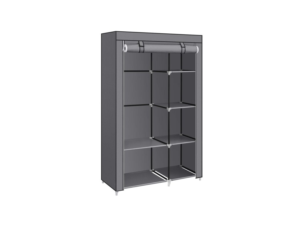 Látková šatní skříň, organizér pro ukládání oděvů, 6 polic, 1 závěsná tyč, netkaná textilie, kovový rám, 45 x 105 x 168 cm, do ložnice, šatny, šedá.