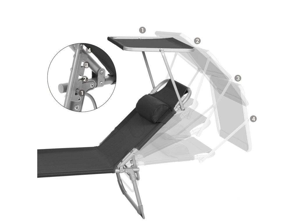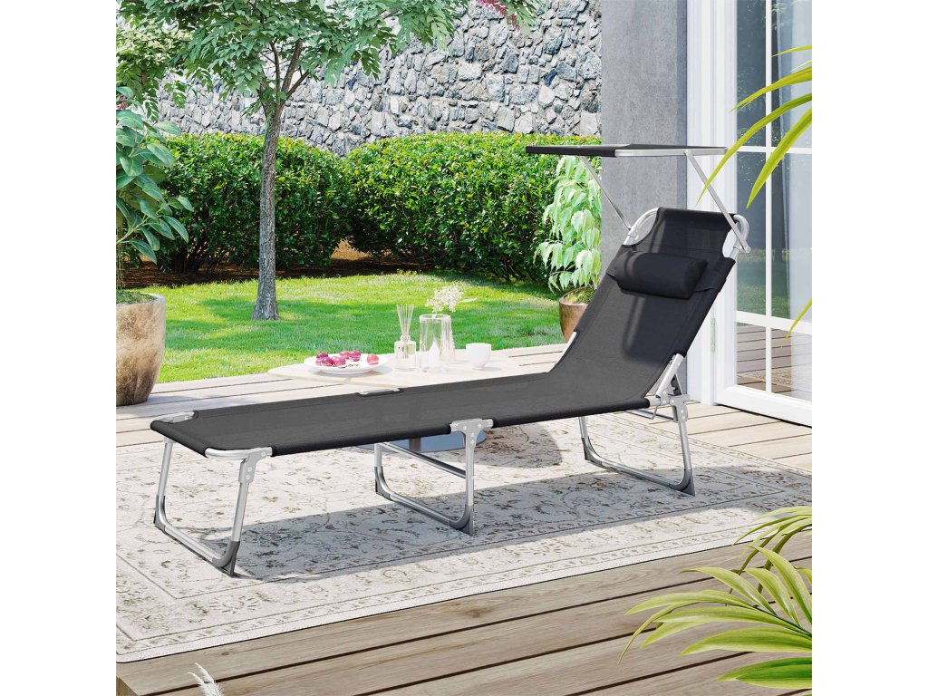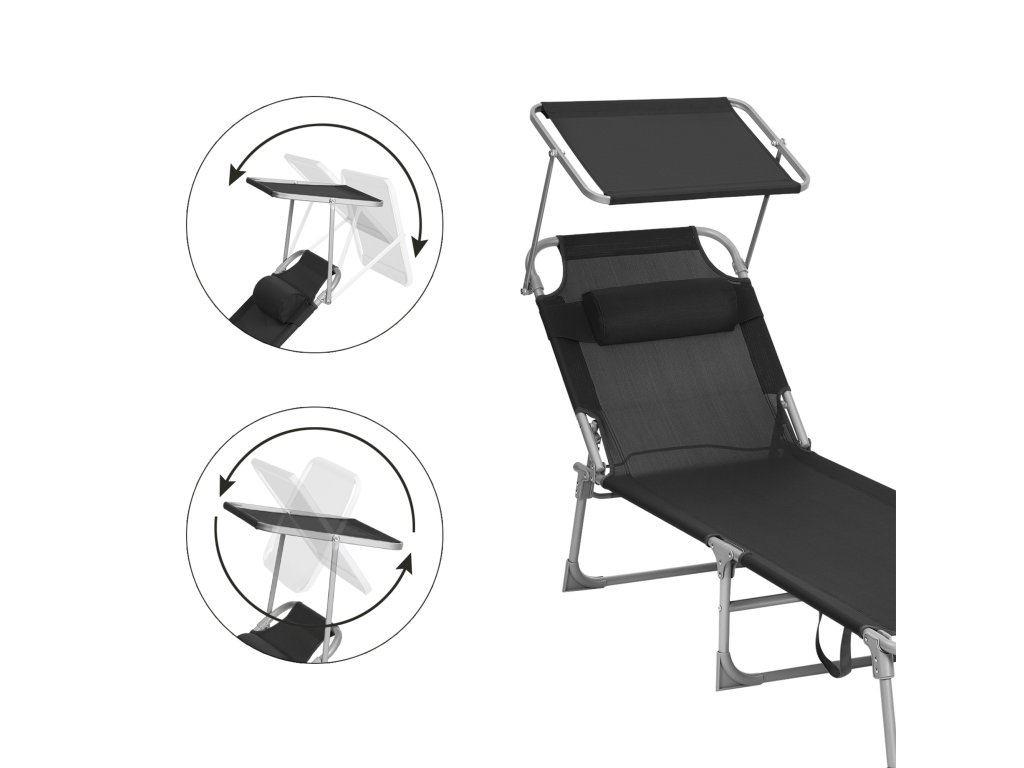 Lehátko, opalovací lehátko, polohovatelné lehátko, s opěrkou hlavy, nastavitelná opěrka zad, slunečník, lehké, skládací, 53 x 193 x 29,5 cm, nosnost 150 kg, na zahradu, černá.
